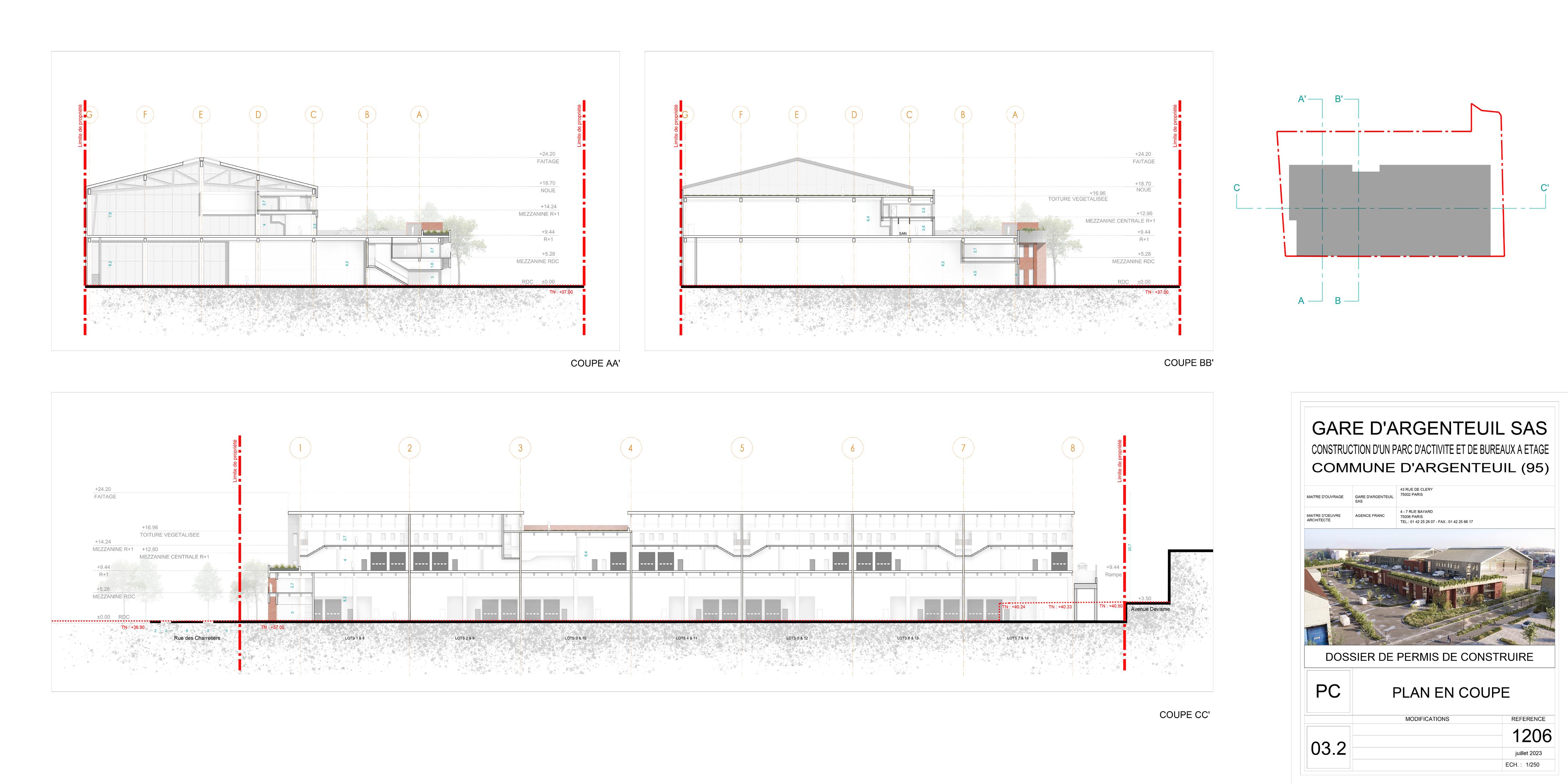 Near the banks of the Seine, just a few kilometers from Paris, a building emerges within the urban fabric of Argenteuil. A first volume made of brick reveals office spaces through slender vertical openings, echoing the area's industrial past. Above, a metal roof rests on the construction. A polycarbonate gable allows a glimpse of the metal structure supporting the building, while also bringing natural light into the interior workspaces. The materiality of the roof and the lightness of the upper volume contrast with the more robust appearance of the brick base. This interplay of volumes, combined with the appropriate structural study, enables the creation of a two-story industrial building, accessible by car on both levels, and featuring green areas on each floor of the project (planters, vegetated roof, etc.).