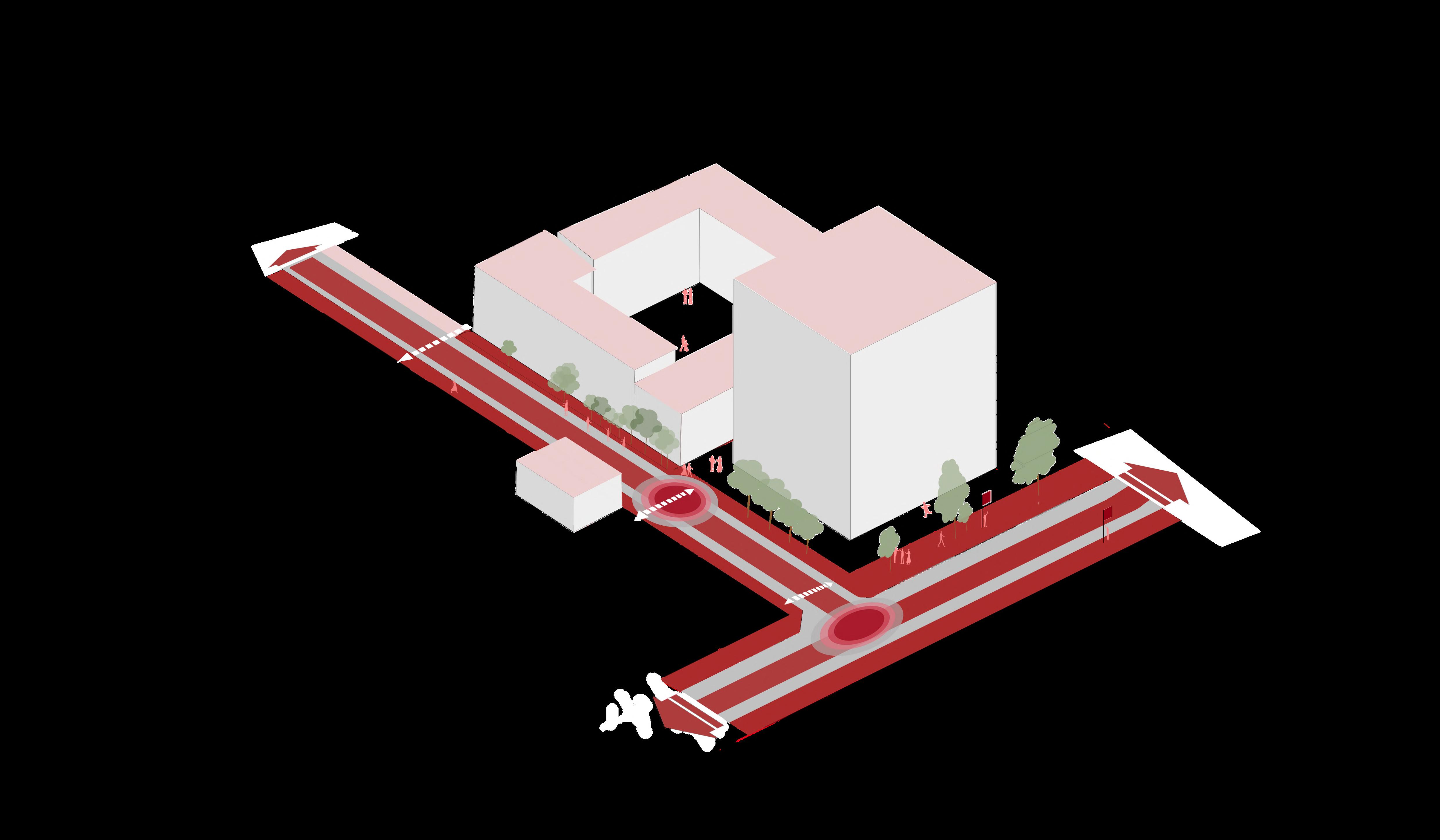 A moving stream that crosses the road or changes direction to reach the UEH university. This break and convergence point (node) forms an intersection of the movement.