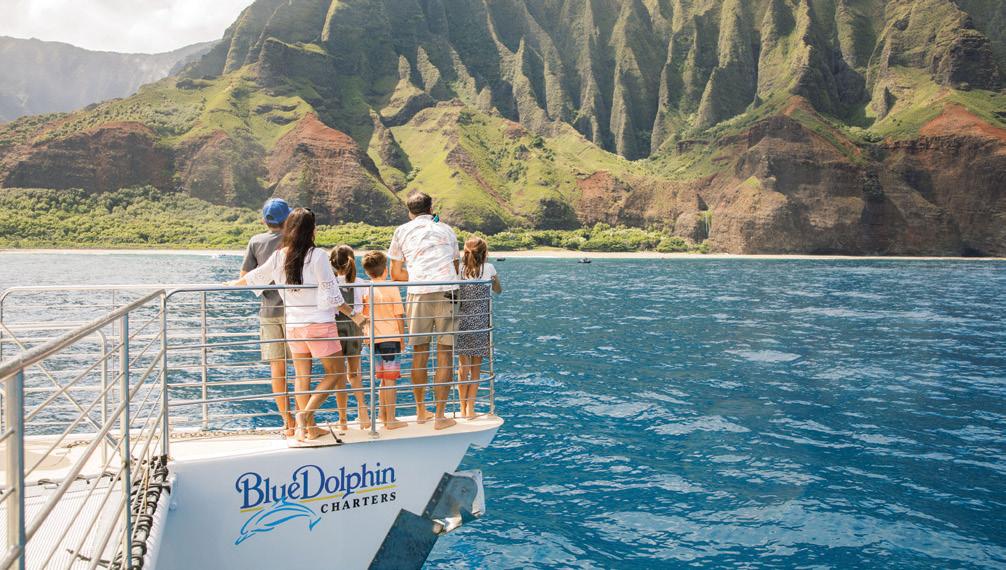Experience the adventures of Blue Dolphin Charters, proudly voted the best Nāpali Coast tour company and Kaua‘i’s best dinner cruise/sunset sail in HAWAI‘I Magazine’s 2025 Readers’ Choice Awards. With more than 30 years of experience exploring Kaua‘i’s breathtaking Nāpali Coast, we offer unforgettable excursions, from spacious catamaran cruises to highadventure raft tours that take you into sea caves and under waterfalls. Every tour in the morning includes our Dolphin Sighting Guarantee, backed by decades of sightings. Whether you’re snorkeling, sailing at sunset, or discovering remote Ni‘ihau, you’ll enjoy stunning views, incredible marine life and true aloha BlueDolphinKauai.com.