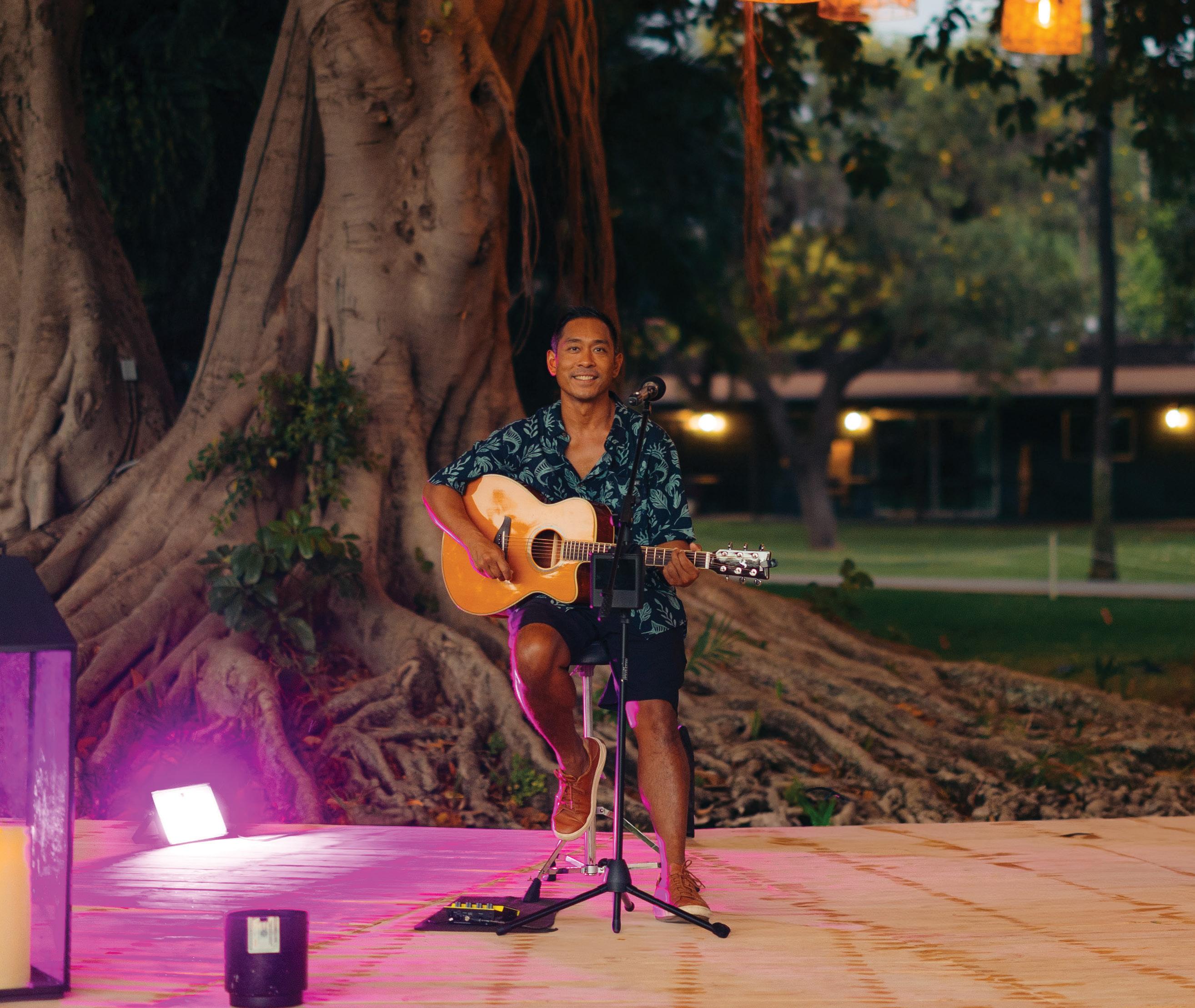 On the lawn, under the sparkling canopy of a century-old banyan tree, Kalani Pe‘a charms and seranades guests. Hailing from Hilo on Hawai‘i Island but now residing on Maui, Pe‘a is a four-time Grammy-winning singer and songwriter.