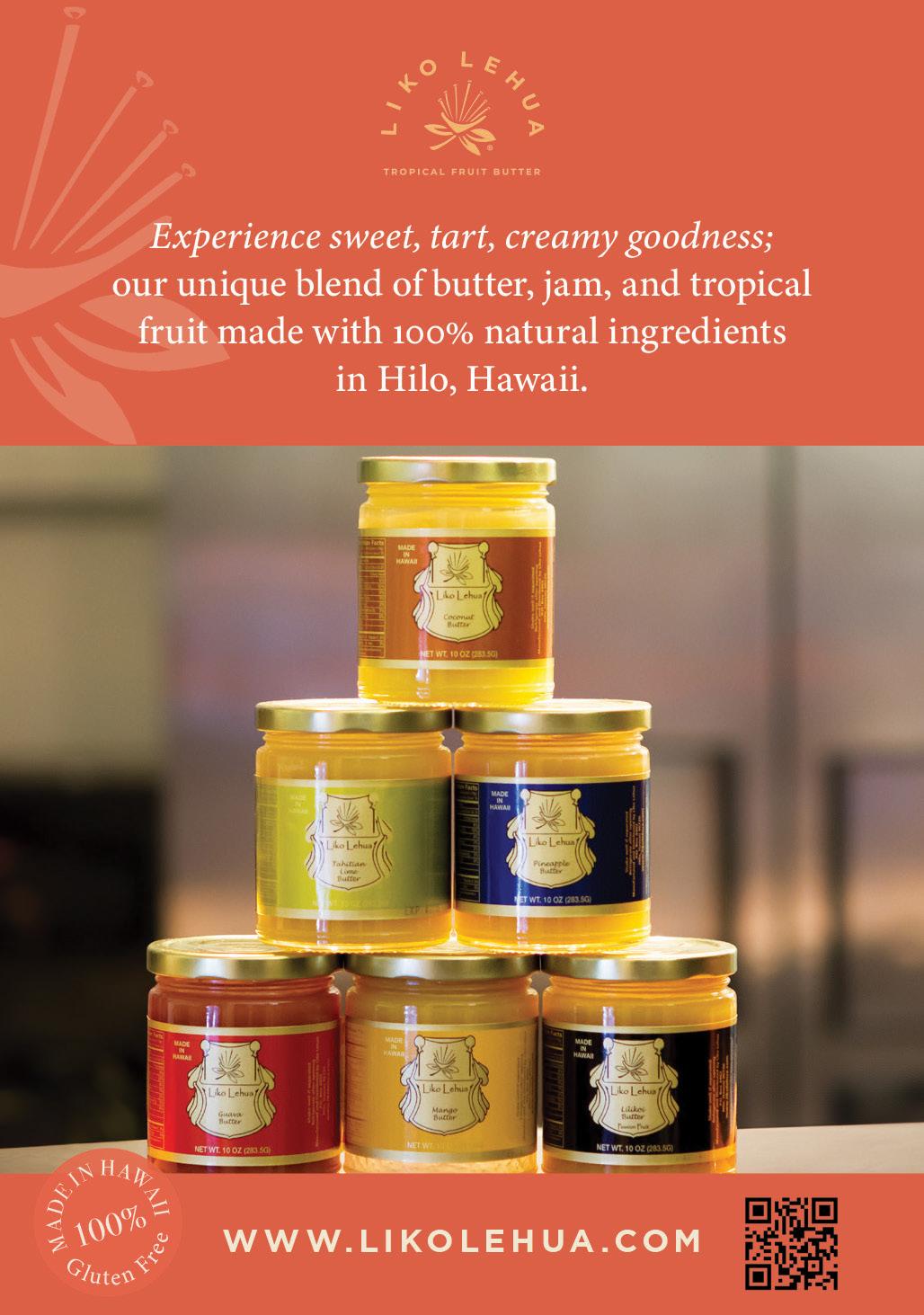 Liko Lehua Liliko‘i (passion fruit) Butter is a unique blend of sweet, tart, creamy goodness made in small batches in Hilo, Hawai‘i, using natural ingredients. $11.85 likolehua.com