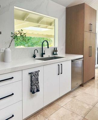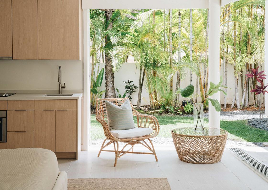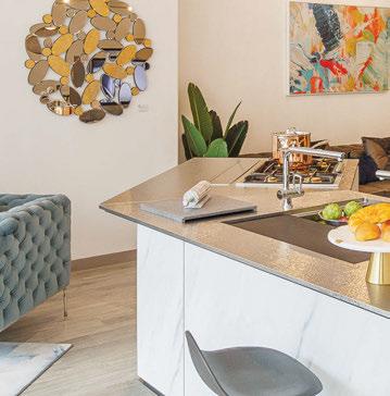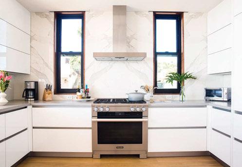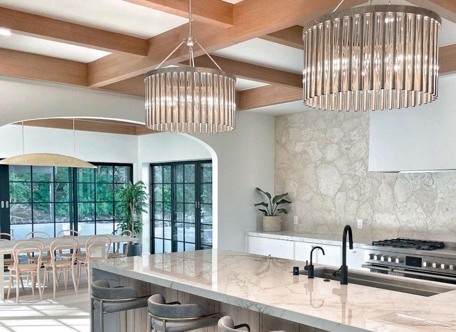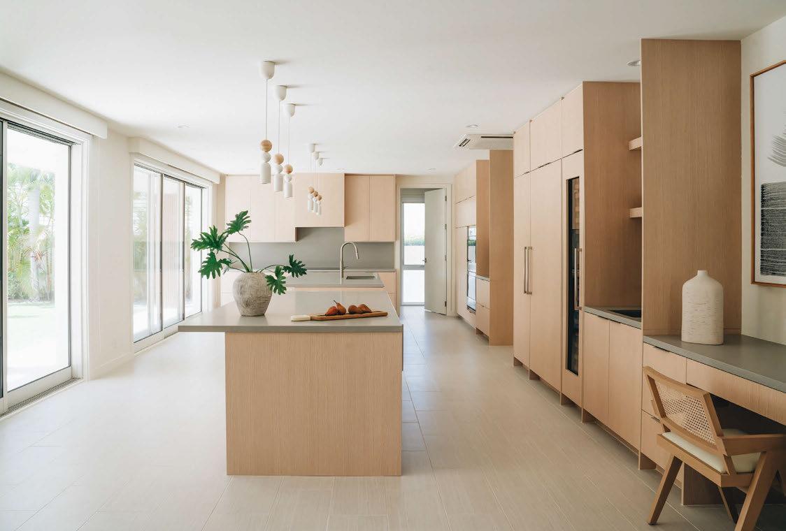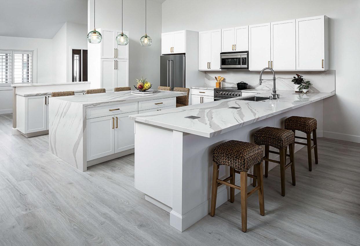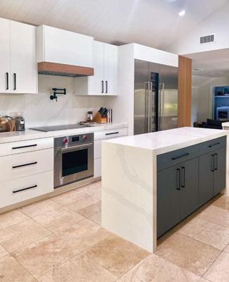 Key ingredients to resort-residential style include white and neutral-colored furnishings — “We always use fabrics that are easily bleachable and furniture that is modern yet durable,” says Johnson — that are contrasted by small pops of color, from art, decorations, plants, cushions and more. Moving appliances like microwaves, blenders and co ee machines into a “butler’s pantry” allows a kitchen to breathe and look more “resortrefined” as well.