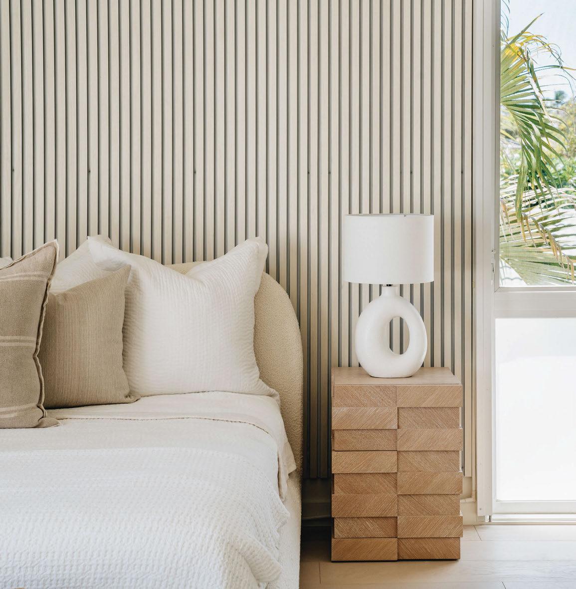 above: Resort-residential design is anchored by a hotel-style bedroom with luxe sheets, bedside lighting and charging stations.