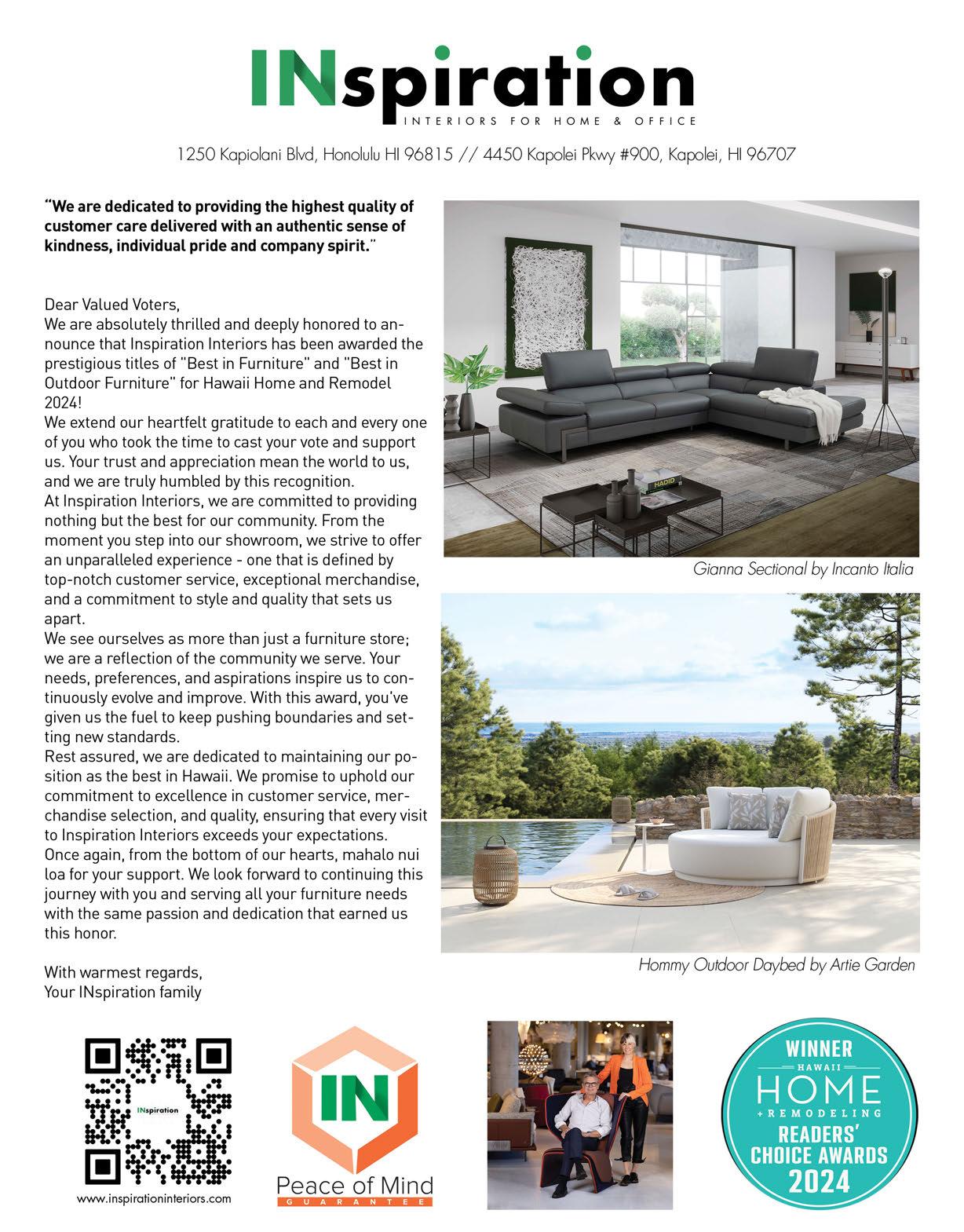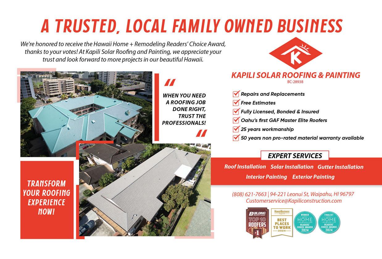 That said, we’ve upped our game for the 2024 Readers’ Choice Awards. We’ve increased the number of categories from 44 to 71, and we’re spotlighting the winner and two finalists within each. Our goal is to expand the Readers’ Choice Awards to show the diversity, quality and talent in Hawaii’s home and building industry. Stay tuned for what’s next!