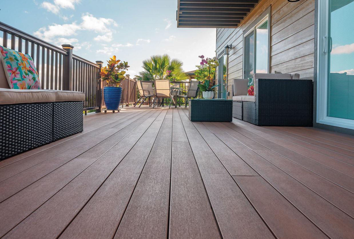 For high-tra c outdoor areas where direct sunlight is ample — like lanai and pool decks where families gather often — we recommend products that are built to withstand heavy moisture and UV exposure. Some options include Sagiper vinyl siding, Longboard aluminum siding, and Azek by TimberTech advanced PVC decking. PVC deck boards are even rated for use on floating docks and poolside. All