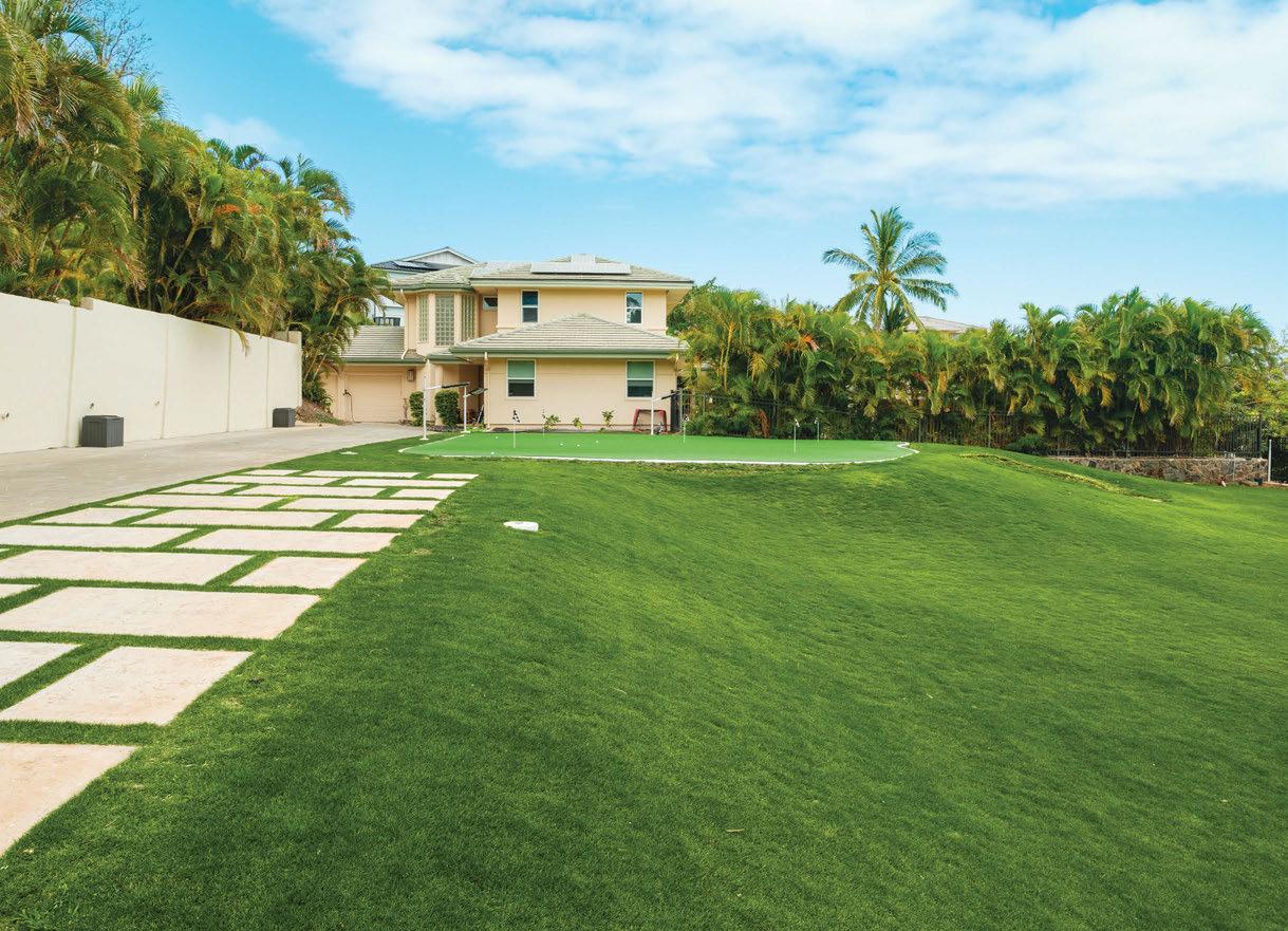 With the help of Hawaiian Turfgrass founder Sean Aukanai‘i Fong, the homeowner curated a fun outdoor living area complete with a putting green and decorative pavers. Stadium Zoysia performs well between pavers and is durable for heavy foot traffic.
