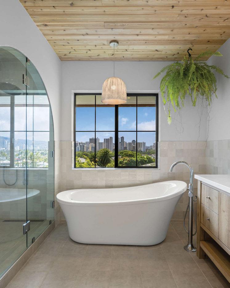 What was the inspiration behind the overall design of the project? The word noe actually means “mist, fog or rain spray” in olelo Hawaii, and we named our studio that because we have always had a fond appreciation for the way that water vapor creates layers in our surroundings here in Hawaii. Whether it’s the light mist hanging over the Koolau Range or a spray of water against the craggy volcanic cli s — we always find beauty in that layering of textural elements. This client really allowed us to explore that idea with her home, with the only qualifiers being that she wanted a Japandi aesthetic that was filled with light neutrals. We utilized light porcelain tiles, natural limestones, light oak woods, and layered all of that with handmade ceramic and plaster light fixtures, natural stone tables and quite a bit of bouclé.