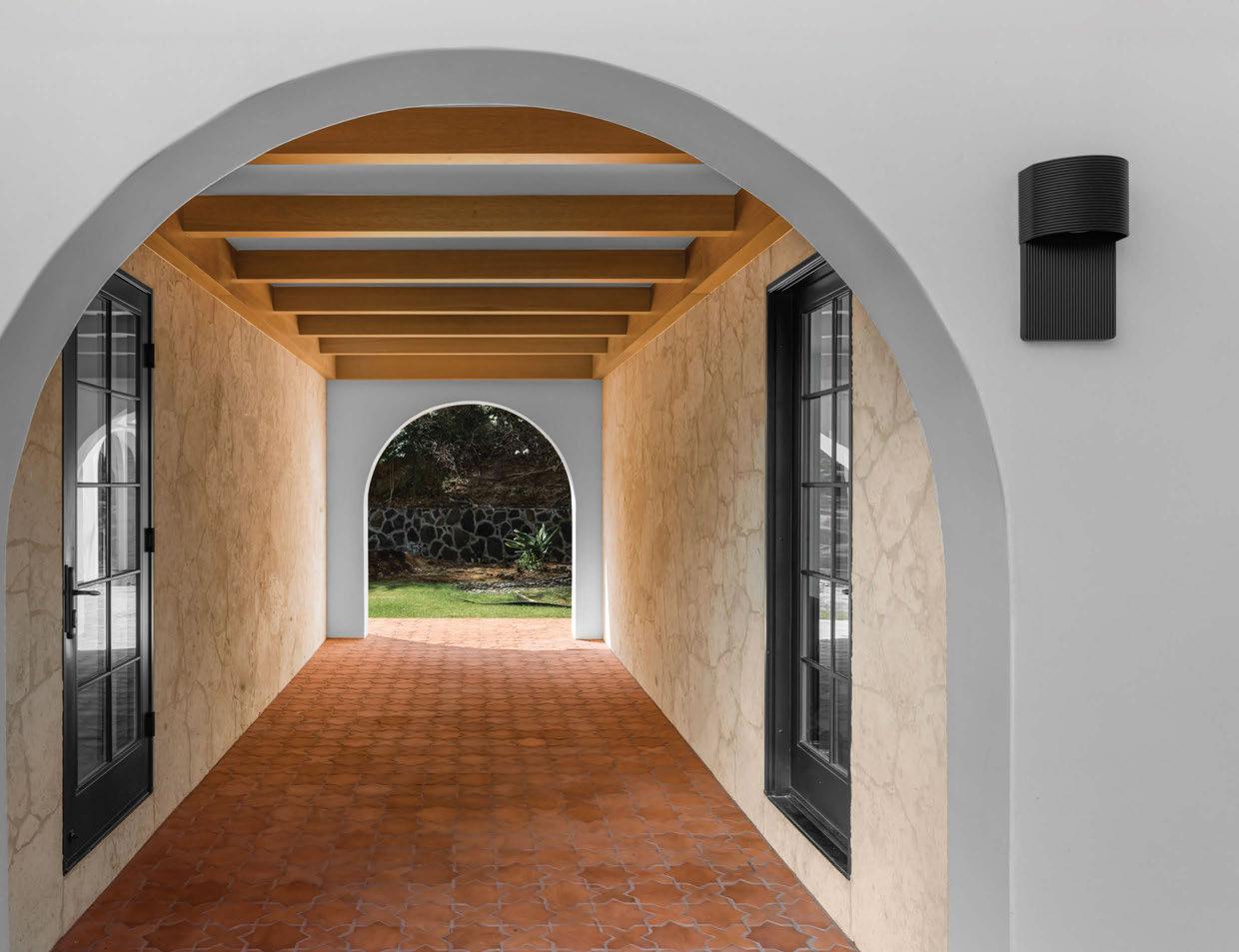 above: Classic villa vibes flow through this stunning breezeway with airy curves and earthy hues reminiscent of Mediterranean architecture.