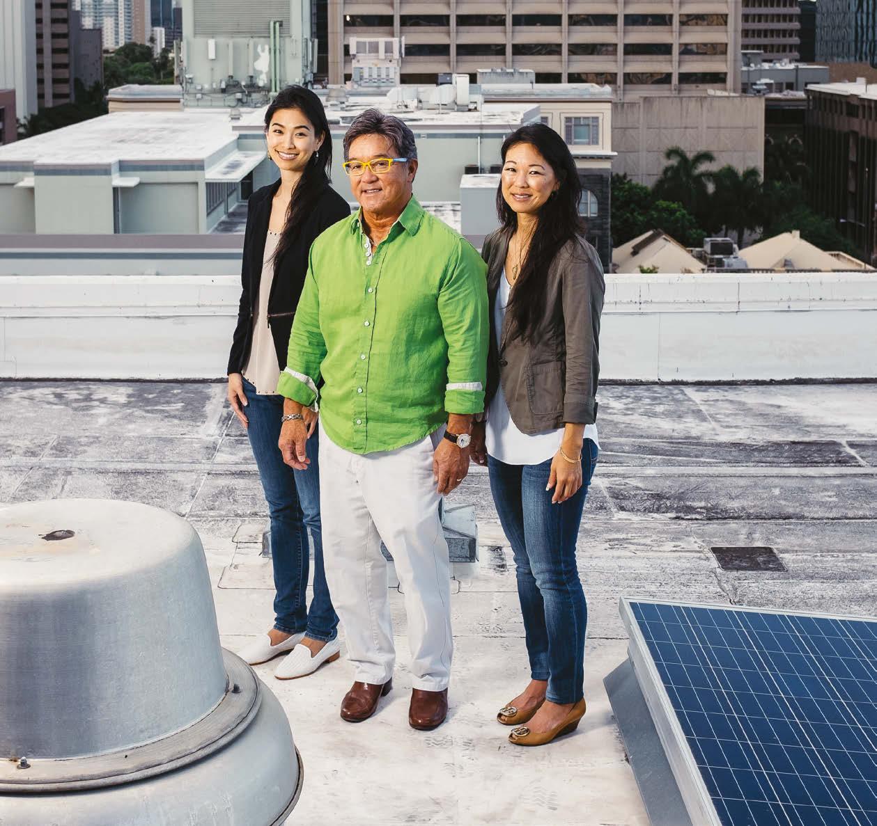 on this page: Candace Williams (in the bottom photo, left) and Dana Akasaki-Kenney share a favorite family shot from 2016 with their father, Guy Akasaki. Together with the team at Commercial Roofing & Waterproofing, they have taken pride in community projects like Kahauiki Village (at the top left) and upgrades at Harbor Court.