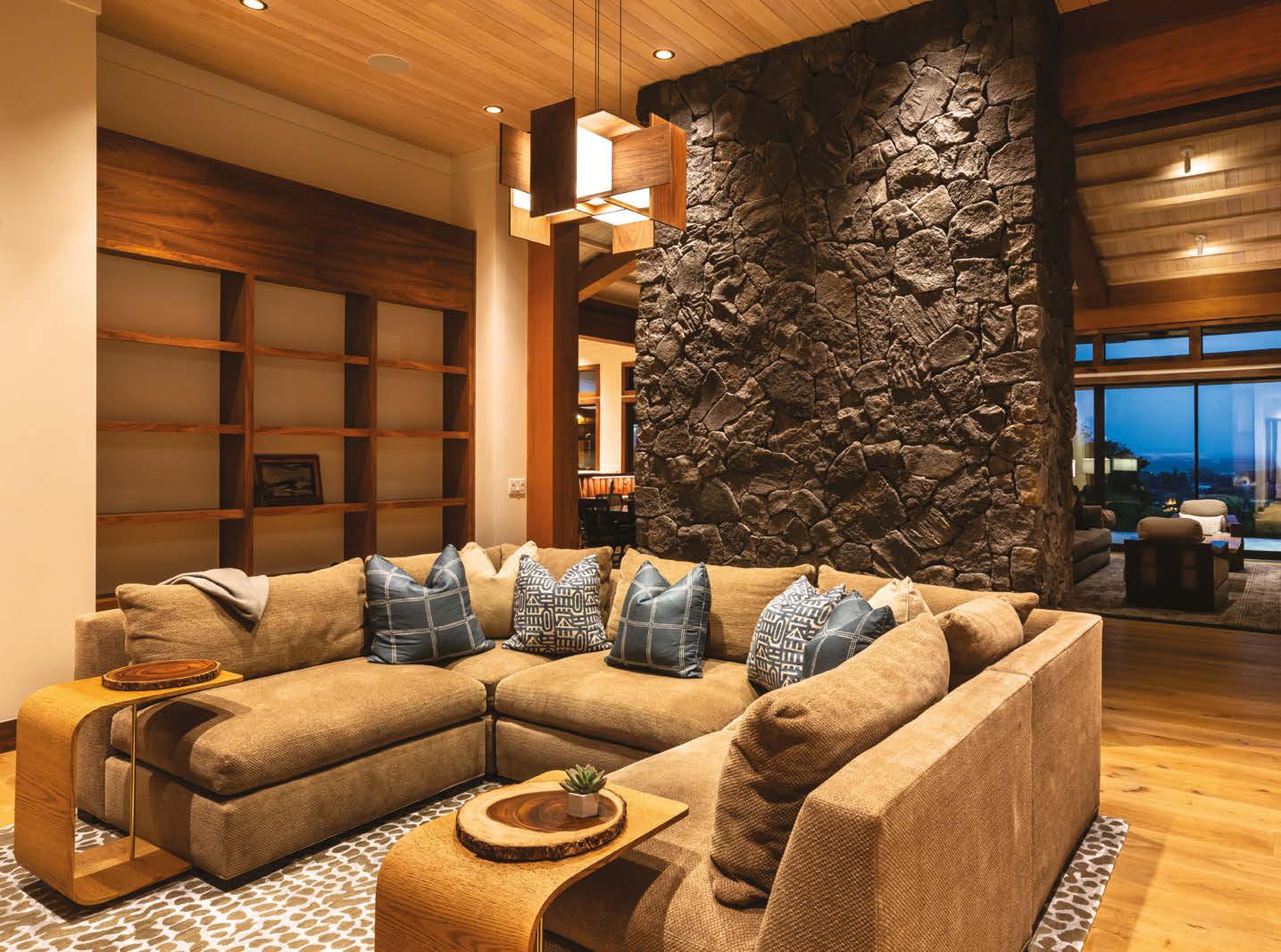 Using organic materials also creates a nature-centric aesthetic that seamlessly transitions from interior spaces like open-concept living rooms or kitchens, to outdoor lounge areas. Solmssen’s Hale Mauna project on Hawaii Island is a terrific example of incorporating nature into a home, with large wood and stone elements throughout. Soaring wood-beamed ceilings, a knotted-wood mantel, natural wood shelving and flooring, and stone used on the fireplace and interior walls imbue a rustic, refined feel.