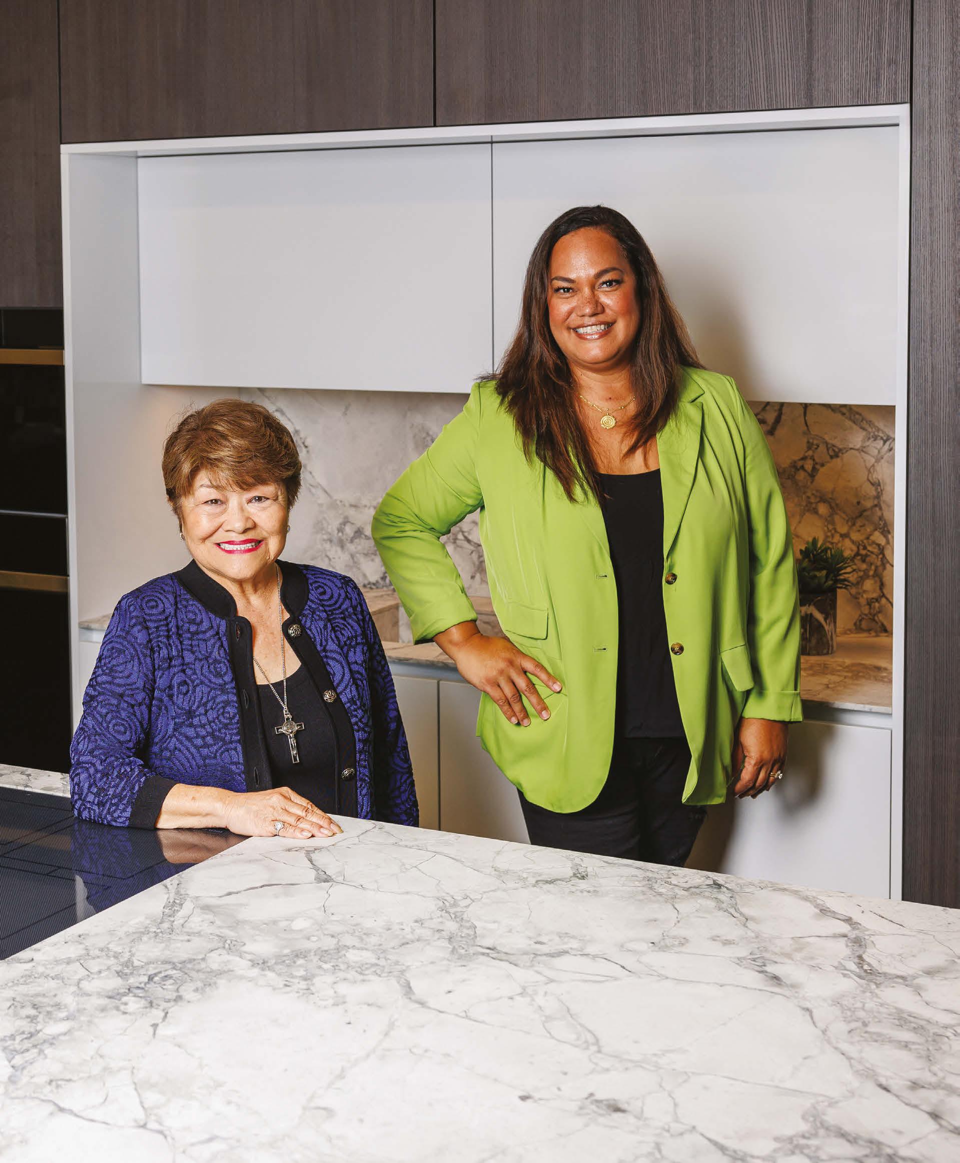 I learned early in my journalism career that the moments after an interview or photo shoot shouldn’t be taken for granted. When the cameras and notebooks are put away, uno cial talk-story sessions often provide the best opportunities to get to know those you are working with. Hinano shared insights about the popular new materials spotlighted in the kitchen vignette where we took photos of her and Karen. I discovered that Karen and I have mutual church connections from my previous job at the Hawaii Catholic Herald newspaper. We all had a good laugh that Karen and Hinano coincidentally wore complementary colors that tied back to the dark blue and bright green in the BIA-Hawaii logo.