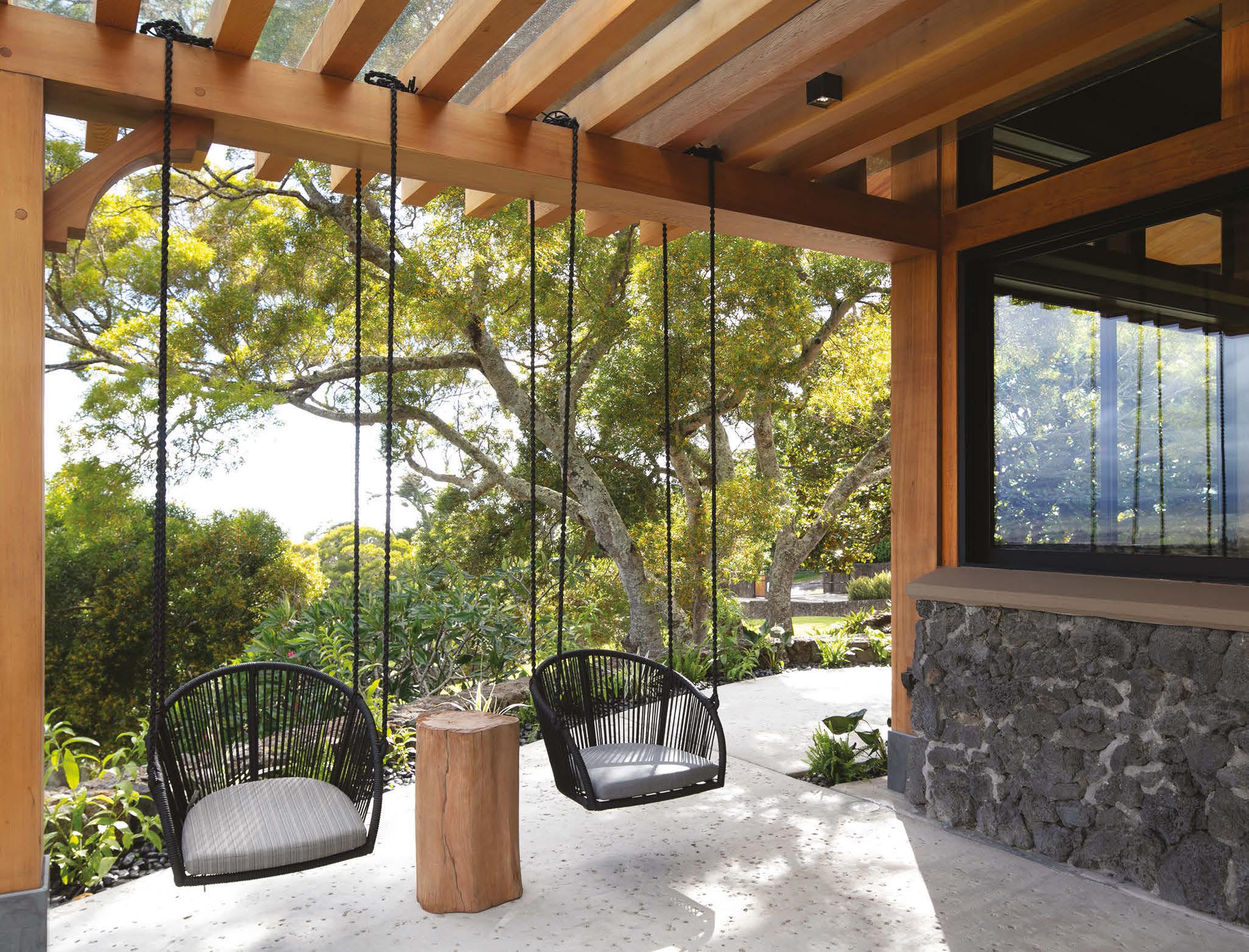 opposite page: For an airy touch of whimsy, Solmssen chose durable and beautiful swing seating for the outdoor lounge area.