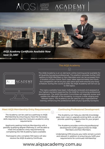 The AIQS Academy is an on dem all Quantity Surveying professio options to AIQS Members The Academy provides continuing professional or N development (CPD) opportunities for AIQS a Members location of your choice. Each and Non-Members. but completion can be at you Undertaking CPD ensures your skills remain current schedule. During the course and relevant in addition to ensuring you fulfill your of requirements for continued membership. to