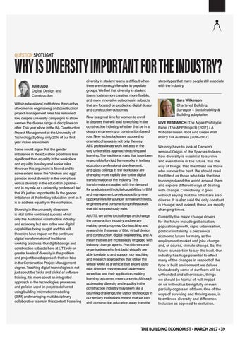 WHY IS DIVERSITY IMPORTANT FOR THE INDUSTRY? Julie Jupp Digital Design and Construction Within educational institutions the number of women in engineering and construction project management roles has remained low, despite university campaigns to show women the diverse range of disciplines on offer. This year alone in the BA Construction Project Management at the University of Technology Sydney, only 20% of our first year intake are women. Some would argue that the gender imbalance in the education pipeline is less significant than equality in the workplace and equality in salary and senior roles. However this argument is flawed and to some extent raises the “chicken and egg” paradox about diversity in the workplace versus diversity in the education pipeline and in my role as a university professor I feel that it’s just as important to fix the gender imbalance at the tertiary education level as it is to address equality in the workplace. Diversity in the university classroom is vital to the continued success of not only the Australian construction industry and economy but also to the new digital capabilities being taught, and this will therefore have impact on the continued digital transformation of traditional working practices. Our digital design and construction subjects here at UTS rely on greater levels of diversity in the problem and project based approach that we take in the Construction Project Management degree. Teaching digital technologies is not just about the ‘picks and clicks’ of software training, it is more about an integrated approach to the technologies, processes and policies used on projects delivered using building information modelling (BIM) and managing multidisciplinary collaborative teams in this context. Fostering