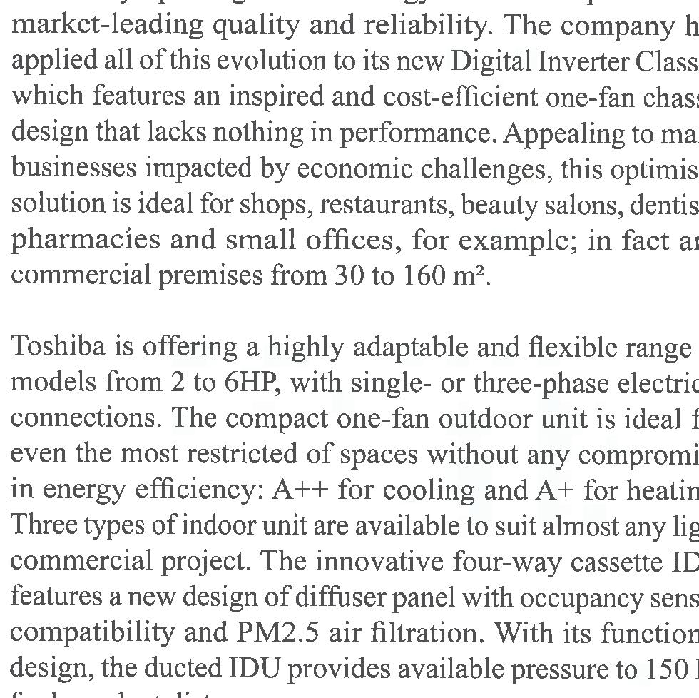 Toshiba ponuja zelo prilagodljiv in fleksibilen nabor modelov od 2 do 6 KM z eno- ali trifaznimi električnimi priključki. Kompaktna zunanja enota z enim ventilatorjem je idealna tudi za najbolj omejene prostore in energetska učinkovitost zato ni nič slabša. A++ za hlajenje in A+ za ogrevanje. Na voljo so tri vrste notranjih enot, ki ustrezajo skoraj vsakemu manjšemu poslovnemu projektu. Inovativna štirismerna kasetna notranja enota ima novo zasnovo difuzorske plošče, ki je združljiva s senzorjem prisotnosti in zagotavlja filtracijo zraka PM 2,5. Kanalska notranja enota s svojo funkcionalno zasnovo zagotavlja razpoložljiv tlak do 150 Pa za dolge razdalje kanalov.