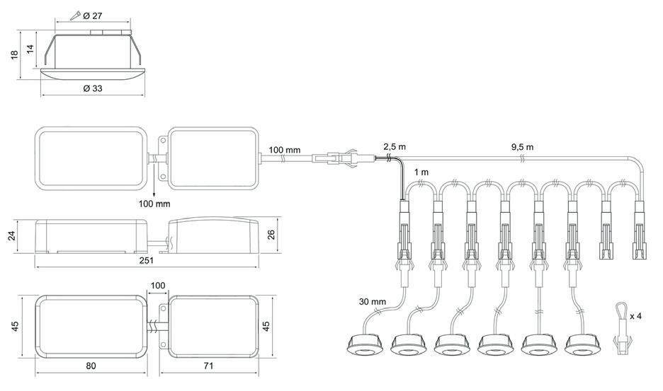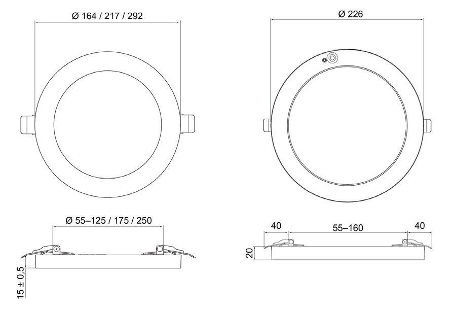 • Katto- ja seinäasennus pintaan tai puoliuppoon. Ketjutus: On/Off, 3 x 2,5 mm2. Radar-mallit 4 x 2,5 mm2