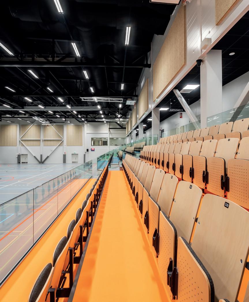 Tervakosken Delfort Areenalla Granlund Häme teki DI ALux-mittaukset liikuntatiloissa eri valaistustehoille. Lii kuntasalin kattopintoihin asennettuja Sport-valaisimien tehoa on nyt helppo himmentää etukäteen Casambilla oh jelmoitujen kahden valaistustasoasetusten kautta täyteen valaistustehoon.
