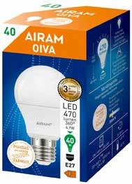 LED general lamps Airam LED 2700K DIM 6 Airam LED 2700K 8 Airam LED 2700K Clear DIM 12 Airam LED 2700K Clear 14 Oiva LED 3000K 16 Oiva LED 3000K clear 18 Oiva LED 3000K DIM 19 Airam LED 4000K DIM 20 Airam LED 4000K 22 Multipacks 26 LED Display Oiva (175) 28 LED Display Matt 2-Pack (187) 29 LED Display 4000K (173) 30 LED Display 4000K Opal 2-Pack (187) 31 LED Display 3000K Opal 2-Pack (187) 32 LED Display Oiva Clear (175 pcs) 33 LED Display 4000 K Clear (173) 34 LED Decorative lamps Decor 360 Opal 3000K DIM 36 Decor 360 Opal 3000K 37 Decor 360 Clear 2200K DIM 38 Decor 360 Clear 2200K 39 Decor 360 Amber 2200K DIM 40 Decor 360 Amber 2200K 41 Decor 360 Smoke 1800K DIM 42 Special LEDs LED DIM to warm 45 LED 3-step DIM 46 Frost -40°C 48 Tubular LED 49 Superlux 50 Radar sensor 51 Sensor 52 Plant lamp 54 Airam Plant Lamp Display (47) 55 Daylight LED 6500K 56 Sauna LED +60°C 57 Solar LED 12V (AC/DC) 58 Lamps with class A energy efficiency 59 LED Extractor Hood Lamp 60 LED Display Frost (106) 61 SmartHome LED lamps SmartHome Opal CCT 62 Smar tHome Clear CCT 64 Smar tHome CCT RGB 65 Smar tHome Amber CCT 66 Smar tHome Decorative lamps 67 SmartHome LED Display (109) 68 Smar tHome LED Lamp/Strip Display (53) 69 Smar tHome LED display RGB 2-pack (42) 70 LED plug-in tubes LED PL lamps 72 LED tubes LED tubes 74 Fluorescent lamps T5 G5 3000K 76 T5 G5 4000K 7 7 Hanging packs T5 G5 3000K 78 T8 G13 3000K 80 T8 G13 3500K 81 T8 G13 4000K 82 Hanging packs T8 G13 2700K and 3000K 83 Starters for T8 fluorescent lamps 84 Plug-in tubes, compact Plug-in socket lamps for magnetic ballast 86 Plug-in socket lamps for electronic ballast 88 T9 round fluorescent lamps 90 2D fluorescent lamps 91 Halogen lamps Halogen linear 230V 92 Halogen G9 230V 93 Halogen G4, GY6.35 12V 94 Incandescent lamps Oven and fridge lamps 95 Candle Flicker lamp 96