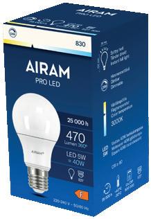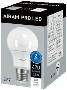 Airam Pro led -sarjassa on opaalikupuisia malleja kahdessa värilämpötilassa, 3000 K ja 4000 K. Lampuilla on täysin kattava 360 asteen valonjako, joten se antaa valoa myös kannan suuntaan. Opaalikuvun ansiosta valo ei häikäise. Kaikki mallit ovat himmennettäviä.