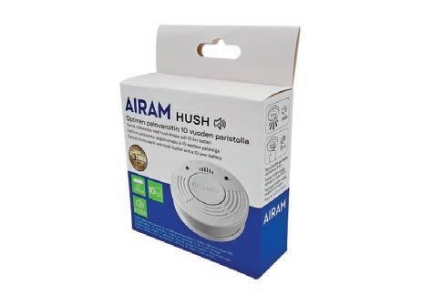 Optinen palovaroitin, jossa sisäänrakennettu 10 vuotta kestävä paristo. Hush-painikkeesta voit hiljentää palovaroittimen aina 9 minuutin ajaksi tarpeen tullen, esim. ruokaa käristäessäsi, ja välttää näin turhat hälytykset. Palovaroitin palautuu automaattisesti aktiivitilaan määräajan kuluttua. Palovaroitin ilmoittaa varoitusäänellä siinä vaiheessa, kun laitteen käyttöikä on päättymässä. Varoitin kierrätetään SER-romuna.