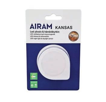 Muotokieleltään siro ja huomaamaton Kansas yövalo luo turvallisen ja pehmeän valonkajon hämärään huoneeseen. Yövalossa on hämäräkytkin, joka sytyttää valon automaattisesti. Kansas-yövalo kuluttaa erittäin vähän sähköä ja on pitkäikäinen. Vain sisäkäyttöön.