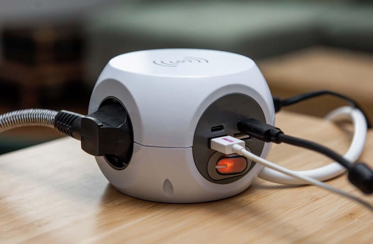 A cube-shaped extension cord with a wide range of functions. The top surface of the Cube extension cord allows you to charge mobile devices wirelessly. One side of the cube is equipped with several USB ports: 2 x USB-C and 2 x USB-A, max. 3.4 A. In addition, the Cube has the option of connecting three other electrical devices to standard sockets. The extension cord has an on/off switch. Cord length three metres, maximum charge 3,680 W. Also includes a base that keeps the Cube in place.