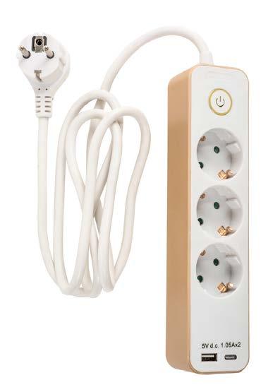 3-piece, gold-coloured extension cord with an on/off switch, two USB ports, max. 2.1 A. Thanks to the flat plug, the Bene extension cord is a good choice for placement behind furniture, as the furniture can then be almost touching the wall. Cord length 1.5 metres.