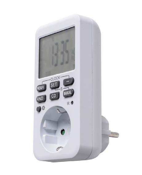 Digital timer with a large, clear LCD screen. Ten programming slots. Set timers on daily or weekly basis (24/7). Two on/off configurations for morning and night, for example. Back-up battery allows you to program the timer without connecting it to an outlet. Stored programs will remain in the memory even after a power outage for up to 100 hours! The Random function increases your peace of mind when you are away from home for longer, such as during a vacation: the function turns lights and other devices connected to the timer on and off at random intervals, creating the impression that the house is not empty. Time displayed on screen. For indoor use.