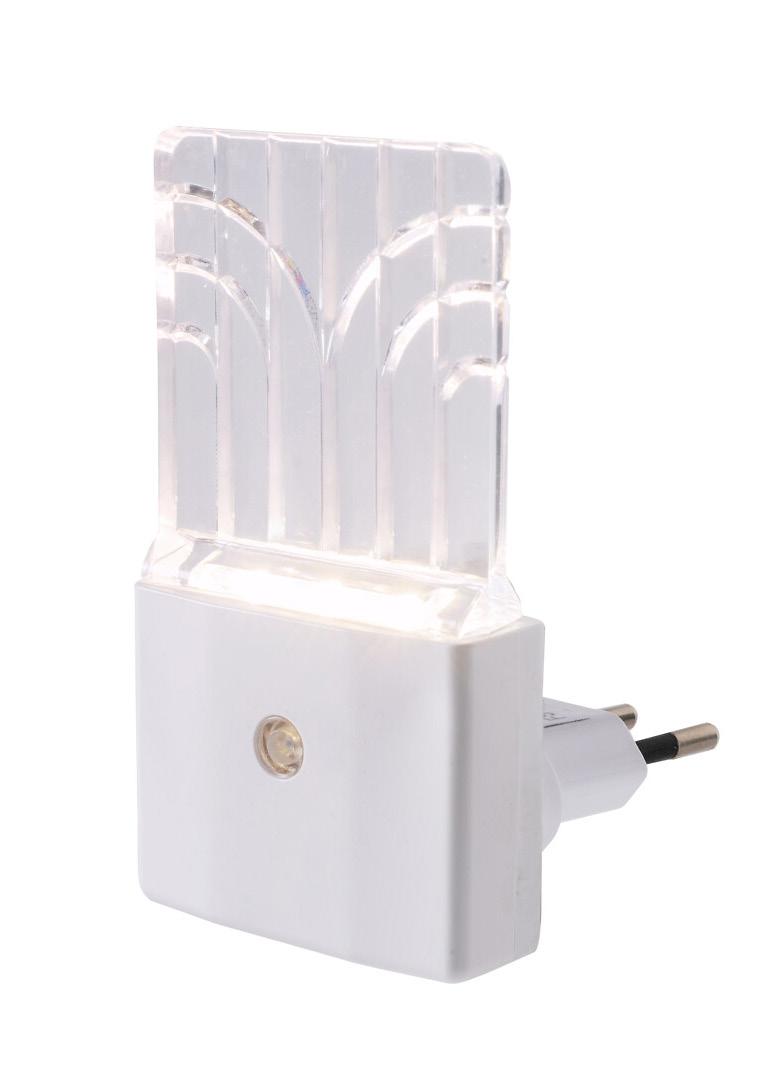 Nattlampan är försedd med skymningssensor och tänds automatiskt när lampan är ansluten till eluttaget. LED-lampan ger ett varmt vitt ljus. Tar liten plats och märks nästan inte i dagsljus tack vare den genomskinliga och platta belysningsdelen.