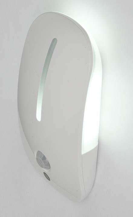 Den stiliga nattlampan Denver är försedd med både rörelsesensor och skymningsrelä. När mörkret faller tänder skymningsreläet automatiskt ljusspringan på framsidan av anordningen. Det starkare ljuset på baksidan av anordningen tänds i mörkret när PIR-rörelsesensorn upptäcker rörelse. Rörelsesensorns sensorområde 100°. Endast för inomhusbruk.