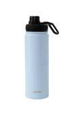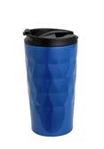 A stylish steel mug. The steel mug has a locking drinking hole and a screw lid with a rubber seal. Colours black, blue and white.