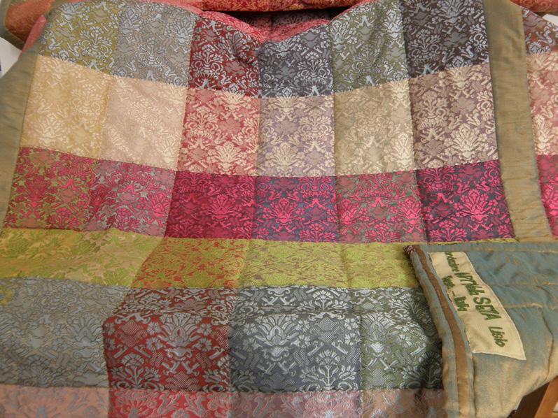 Piccola coperta “buttalà” in seta cangiante decorata con motivi vegetali nelle tonalità dell’arancio, rosso, verde, viola, azzurro, sete donate dalla Fondazione Arte della Seta Lisio e realizzata dalla donatrice, cm 165x160