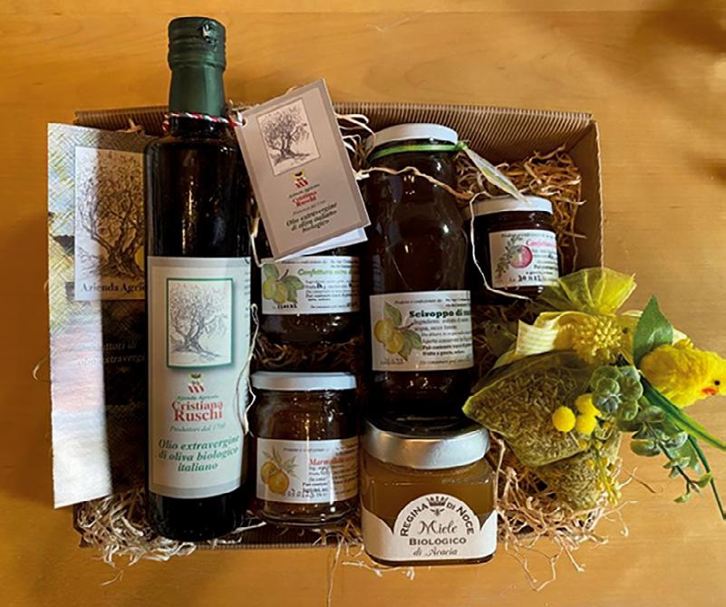 Cesto di prodotti dell’Azienda Agricola Le Prata (PI) e di altre aziende locali, contenente pasta di farro perlato, passata di pomodoro gr 500, pomodoro naturale gr 360, rustica di pomodoro gr 500, cubettata di pomodoro gr 500, ceci, farina di ceci, composta di cipolle, riso integrale biologico di Grosseto, pasta di grani antichi, olive in acqua e sale, noccioline di Venturina (LI), crema di zucchine, cetrioli sottaceto