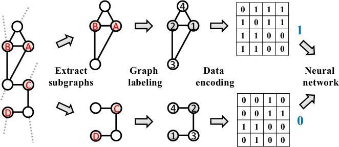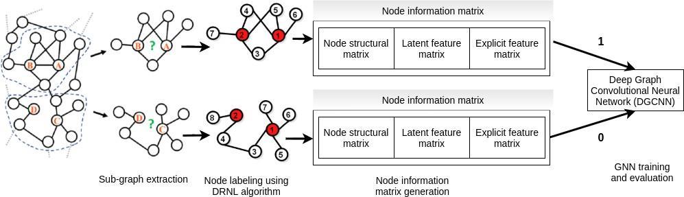 As illustrated in Fig. 2, WLNM is a three steps link prediction approach that starts with extracting sub graphs those contain a predefined number of neighbour nodes, labelling and encoding the nodes in the sub graph using WL algorithm and ends with training and evaluating the neural network. WLNM is a simple GNN based link prediction approach which is able to learn the link prediction heuristics from a graph. The downside of WLNM is that it truncates some neighbours to limit the sub graph size to a user defined size which are may be informative for the prediction task.