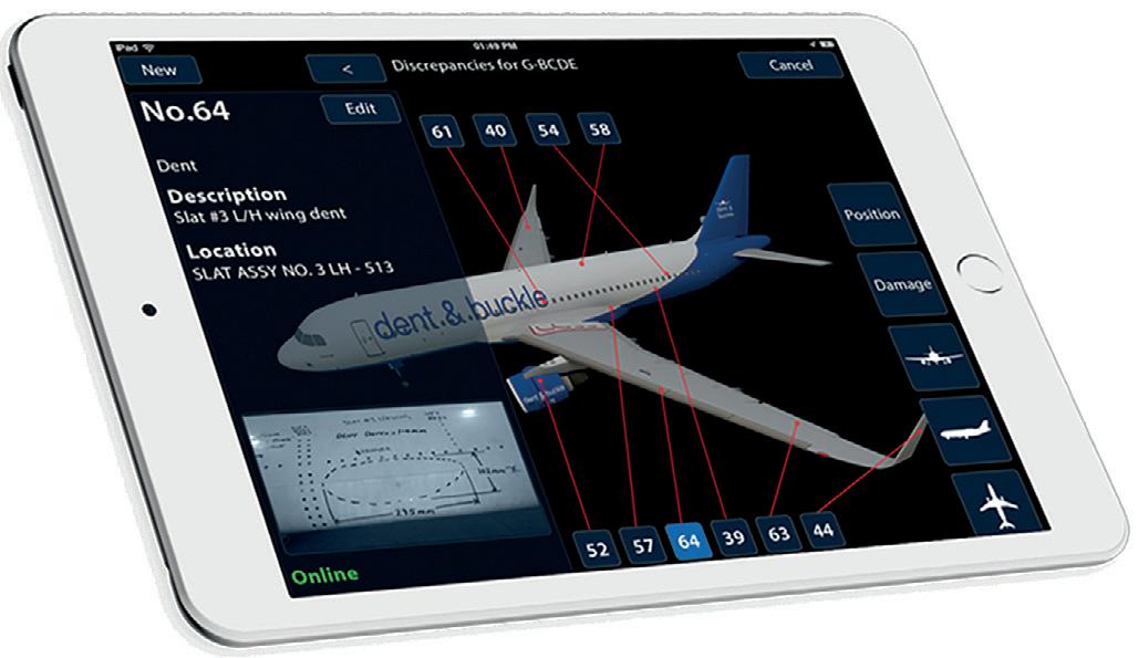 Dent & Buckle, a comprehensive system for managing complete airframe damage and repair records, dent & buckle is a powerful web-based application for engineering departments, providing a 3D graphical view, with advanced document handling and reporting tools. Additionally, Dent & Buckle has a mobile app available for iOS, Android and Windows devices, allowing maintenance crews and pilots to access information in real-time while on the go. With Dent & Buckle, users can easily track and manage all airframe damages, repairs, and maintenance records in one central location. This system streamlines the repair process and improves communication between teams, ensuring compliance with safety regulations and improving the overall efficiency of the user organization