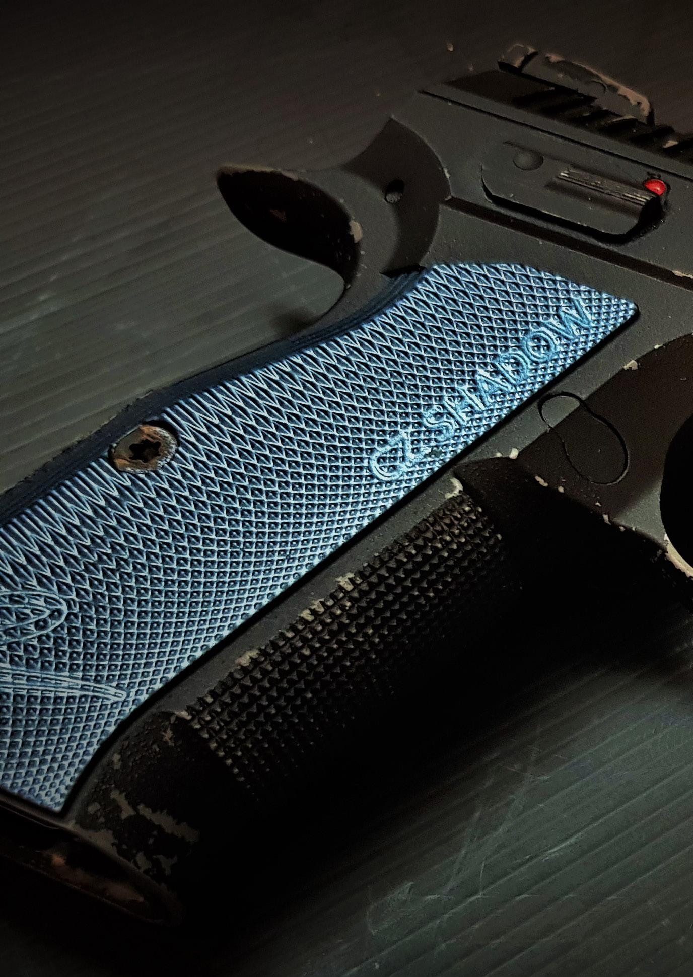 The trigger is slightly re-profiled to make it flatterfaced and further forward than the SP01, which seems to make it more comfortable to actuate, as well as slightly shorter to enable the bottom edge of the trigger guard to be squared off without sacrificing the indent at its rear that allows the strong hand middle finger to ride higher into the frame. The front edge remains fairly square vertically and retains the serrated front surface of the SP01 for support hand grip if that style of handling is preferred and likewise, the deep scallops in the frame above the triggers are retained, allowing the support hand to achieve the same thumb drive grip or higher on the frame. The front and back straps of the frame are also more textured than those of the SP01, with all round meat mallet style checkering that improves grip over the predecessor’s thinner patches.