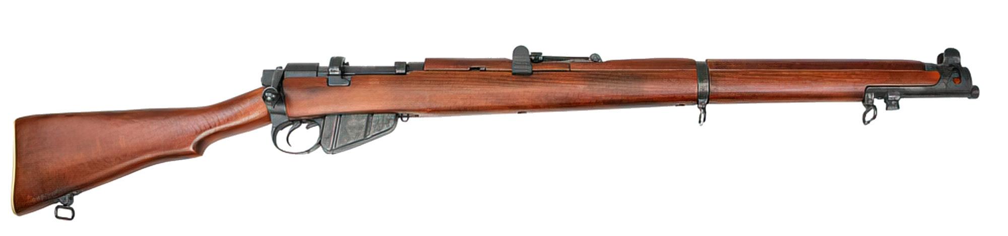 The key word in the SMLE’s designation is ‘Short’, which actually has nothing to do with the length of the magazine, but instead refers to the overall length of the rifle as compared to the issued models that had gone before. Due to the more efficient .303 cartridge it was possible to have an overall shorter rifle without any loss of range or accuracy, and WWI proved this point as the SMLE showed plainly that it was a most effective rifle in use in the harsh, trench-warfare conditions, being acknowledged by all as reliable and hard-hitting, although potentially not as accurate as the Mauser Gewehr 98 it faced across No Man’s Land all too often. The SMLE Mk III was distinctive in outline, featuring a full stock with a hand recess, along with a distinctive muzzle cap and the sight-protecting “dog ears”. The Mk III* came about as an attempt to increase production during WWI and because of this it did away with the long-range sights and magazine cut-off which the Mk III featured. In 1926 the SMLE was re-designated ‘Rifle No 1 Mark III (or III*)’, and production continued until 1939 by Birmingham Small Arms Ltd.