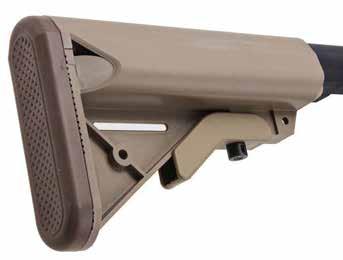 “CONTROLS ARE “SCAR STANDARD, SO AMBIDEXTROUS “S-1-A”, AND THE MAG RELEASE ALSO FEATURES ON BOTH SIDES. THE COCKING HANDLE CAN BE RESET L-R WHICH IS ALSO GREAT. THE STOCK IS THE STANDARD “SCAR/UGG” TEMPLATE WHICH I KNOW SOME FOLK DISLIKE AESTHETICALLY, BUT THE FACT IS THAT IT WORKS WELL WITH THE LENGTH OF PULL AND CHEEK RISER”