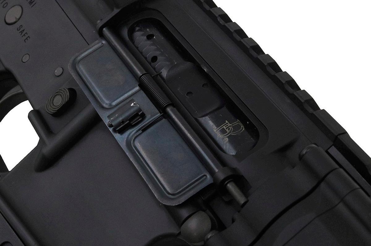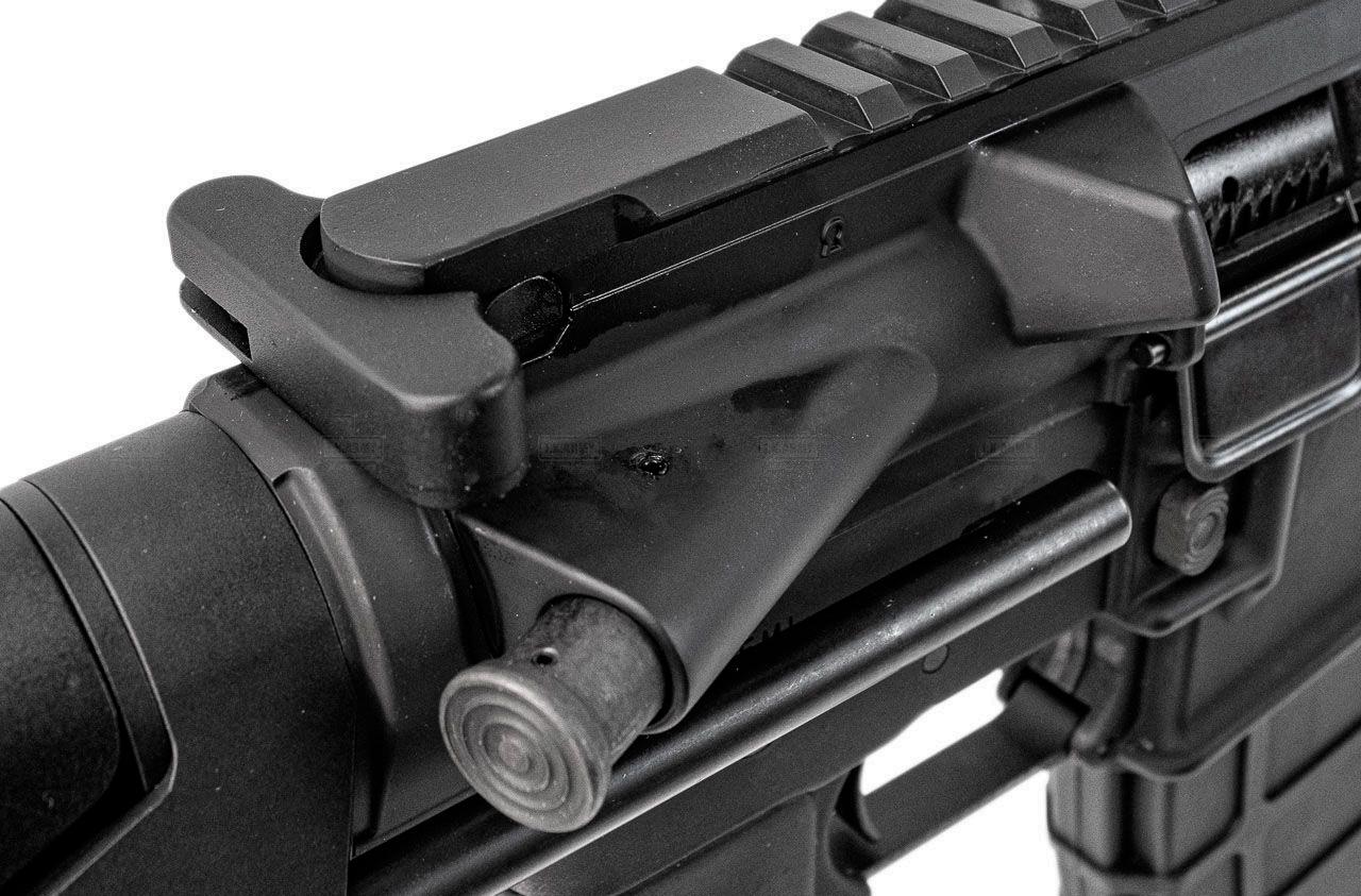 A few additional features of the upper receiver include the charging handle, improved hop up chamber and compression unit, and pitch thread of the receiver. First, the charging handle is now fully functional and required to load the first BB into the chamber, and this also means with the real sizing of the receivers, real steel charging handles are now drop in compatible with the EVOLT replicas.