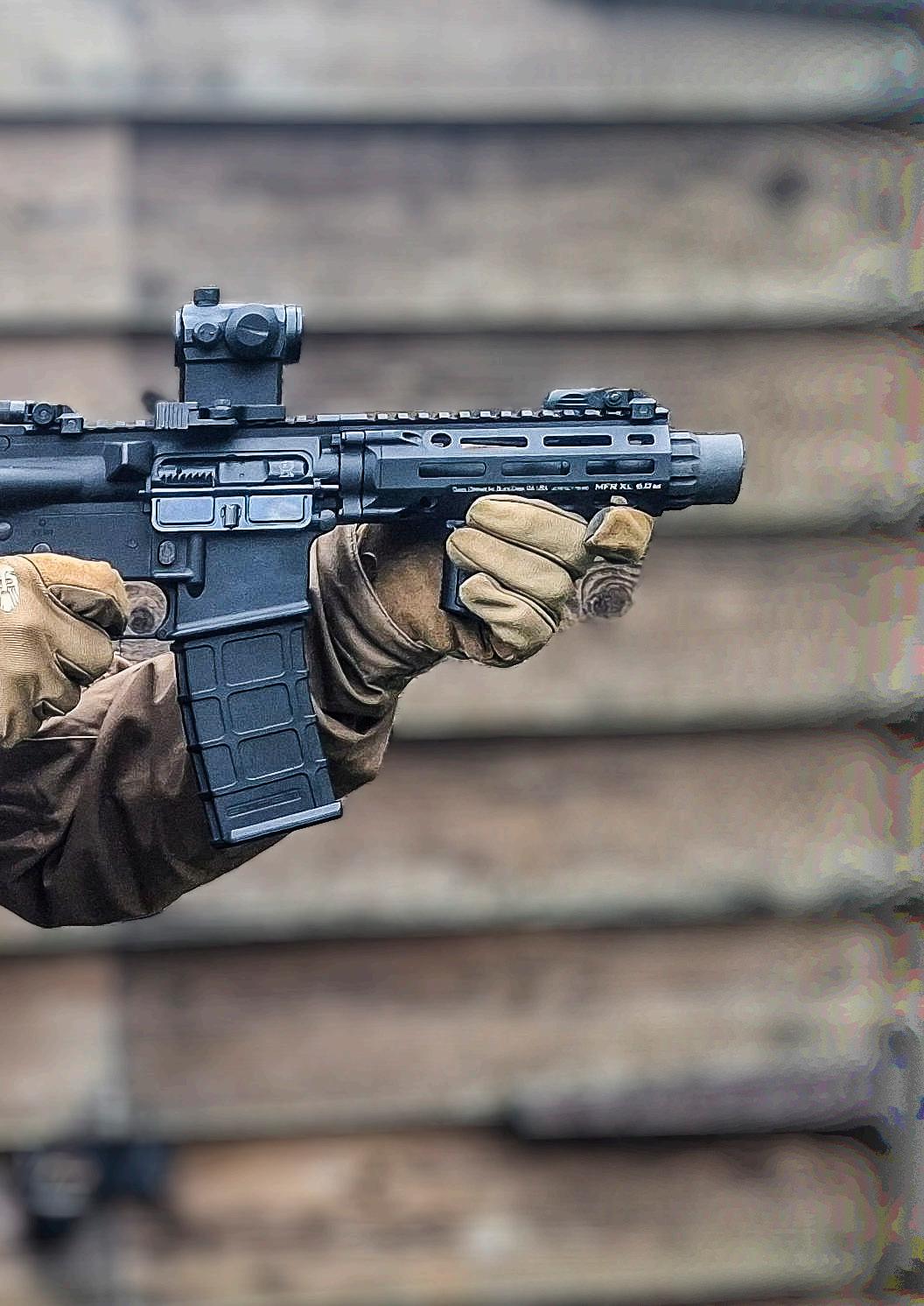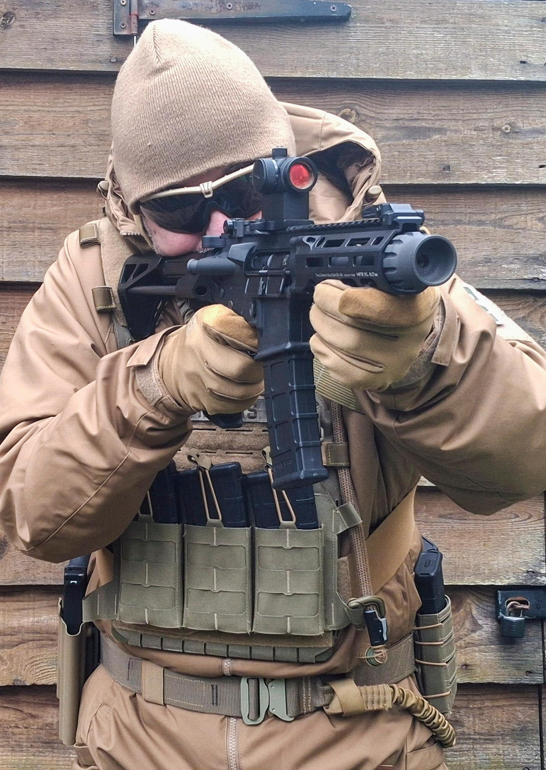 So, the DDM4 PDW GBBR… I love the design aesthetic from the linear compensator at the sharp-end through to the minimalist stock at the rear, and onto that distinctive, stubby M-LOK rail; once again I’ve added my usual stunty foregrip and RDS so it feels comfortable for me, and the overall length of 640mm (stock fully extended, 530mm fully closed) and weight of 2600g is absolutely perfect in my mind for a fast-mover CQB-focused tool.