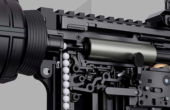 Externally, the EVOLT series will all feature realistic upper and lower takedowns, and all uppers and lowers will be compatible with each other for maximum customization. The upper and lower receivers will also be 1:1 scale to real steel rifles meaning compatibility with multiple real steel parts and furniture. The upper receivers will feature the barrel, bucking, chamber, charging handle, and recoil weight systems. The recoil