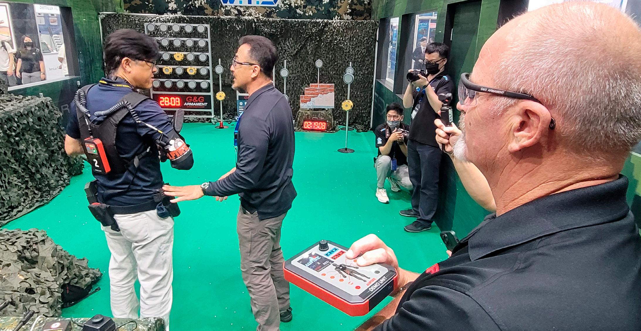 representatives for. ‘BigXReality’ were showing small unit tactics (SUT) simulations with small arms, shoulder-fired launchers like the Stinger or Javelin and battlespace control touchscreen systems all integrated with the headsets. They also have a facility very close to me in the West of Taipei whom I might get around to visiting when we finally get through our backlog of other manufacturer visits we’ve yet to write up!