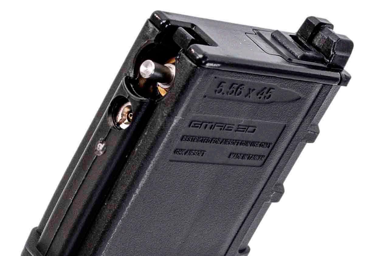 dual-powered just like older versions, making use of both green gas with V3 CO2 magazines too. The V3 magazine has been modified structurally in terms of the magazine lip shape, to improve the impact and wear due to bolt operate, the internal reservoir compartment has been optimised to improve gas volume and efficiency, and a new follower design enhances the empty position to make the bolt catch function more stable. I can tell you though that my GHK V2 test-magazines appear to work just fine in terms of feeding, although I did notice that the bolt didn’t lock back on empty on a couple of occasions.