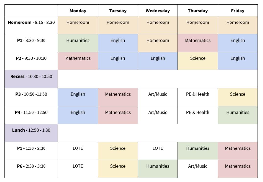 Students will receive their individual timetables at the beginning of the year. Homeroom Teachers will support students in understanding and using these as they work towards managing their schedules with increasing independence.