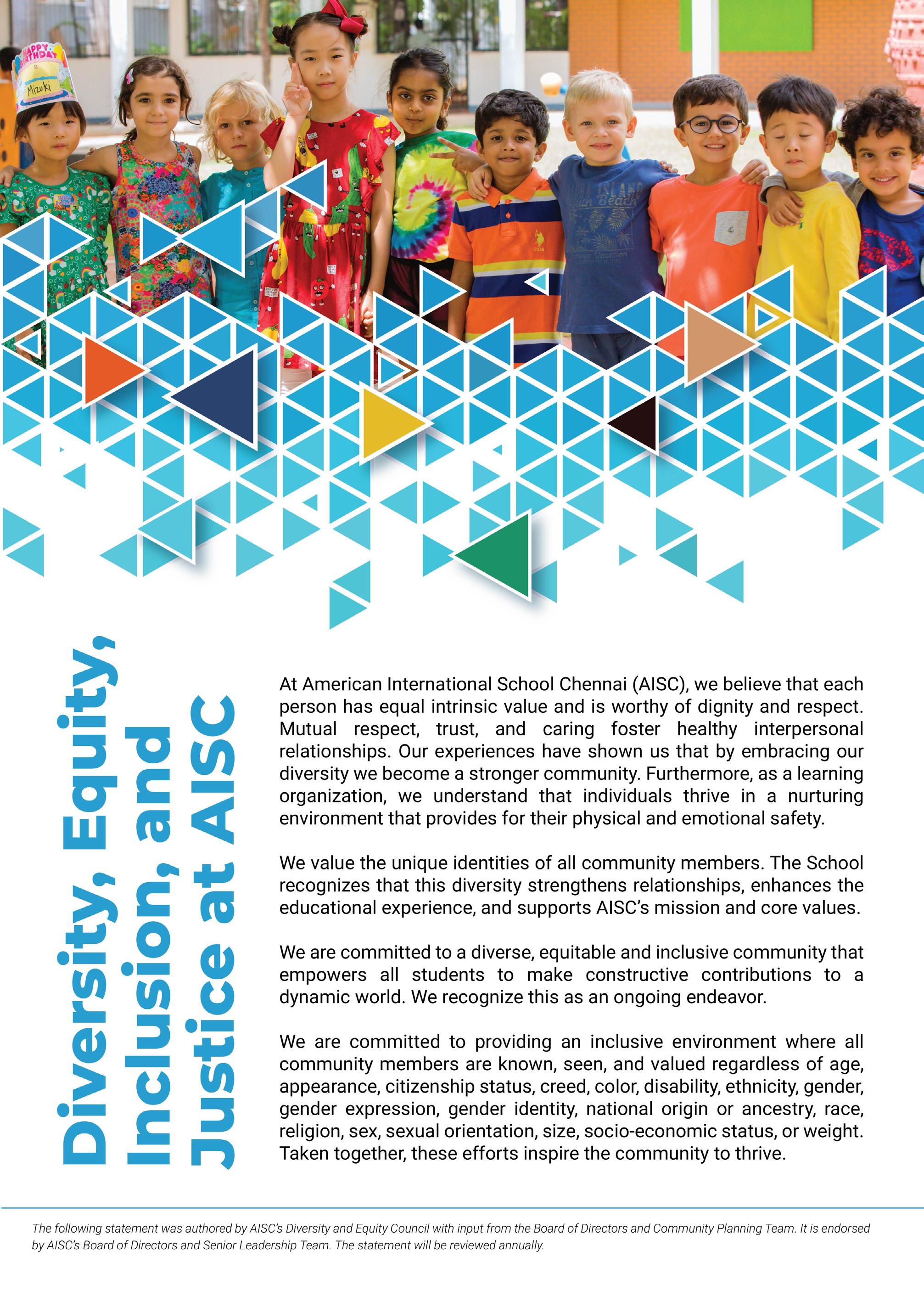 The American International School Chennai values the diversity in our community and is committed to providing an inclusive and equitable environment. All members of the community deserve to be treated with respect, protected from intimidation, harassment, and/or bullying, and free from discrimination on account of actual or perceived age, appearance, citizenship status, creed, color, disability, ethnicity, gender, gender expression, gender identity, national origin or ancestry, race, religion, sex, sexual orientation, size, socio-economic status, or weight. The School treats all students equally in allowing them access to courses of study, career guidance, preparation and qualifying examinations for further study, athletics and extracurricular activities.
