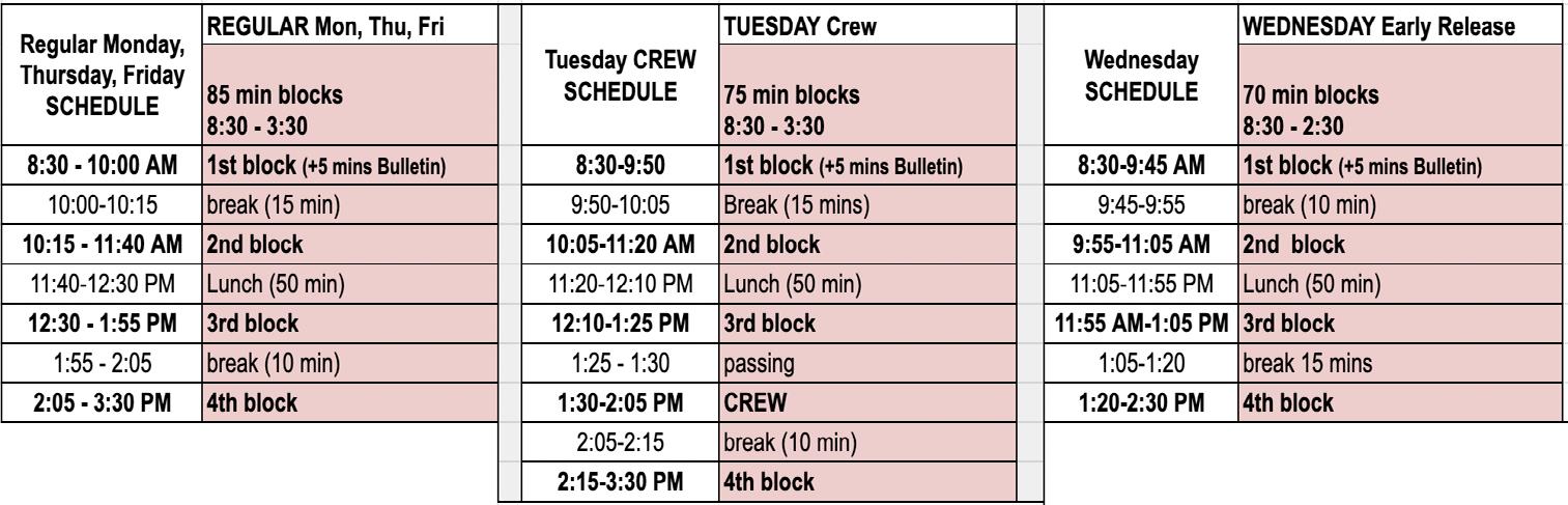 The school day starts at 8:30 a.m. and ends at 3:30 p.m, unless otherwise communicated. The daily schedule is based on 8 blocks of 85 minutes with alternating Day A and Day B.