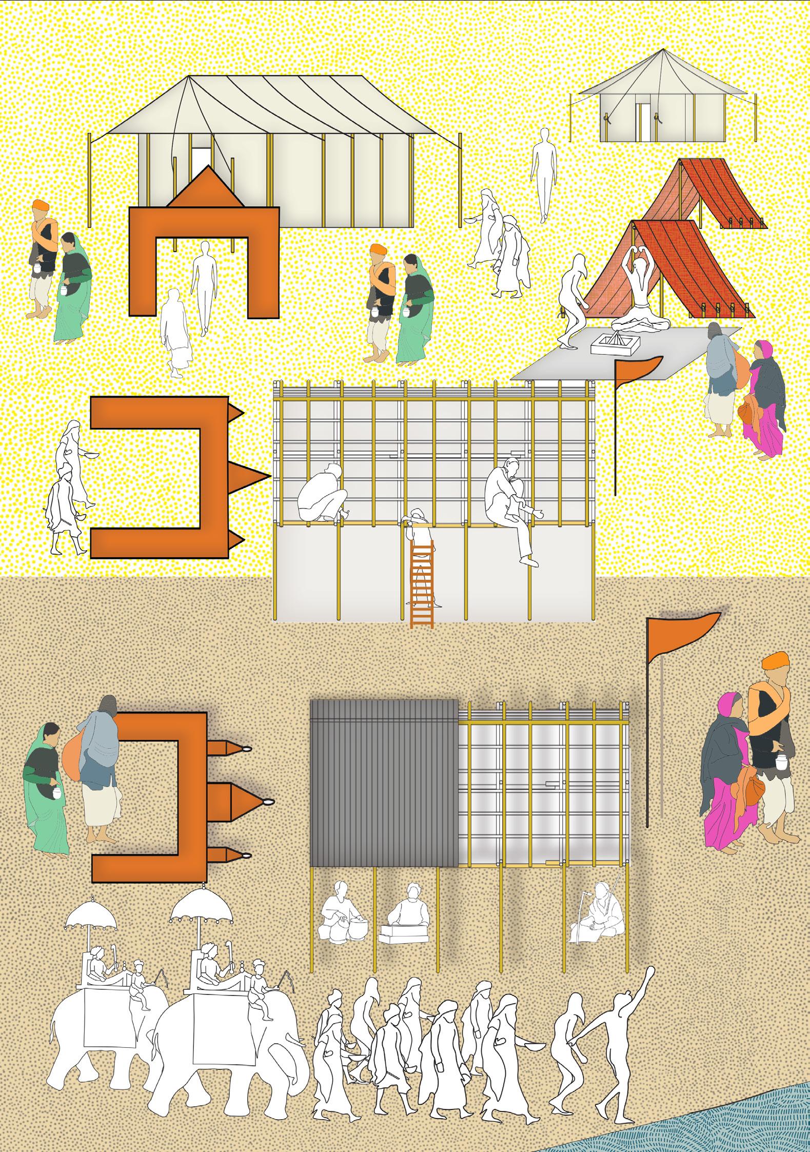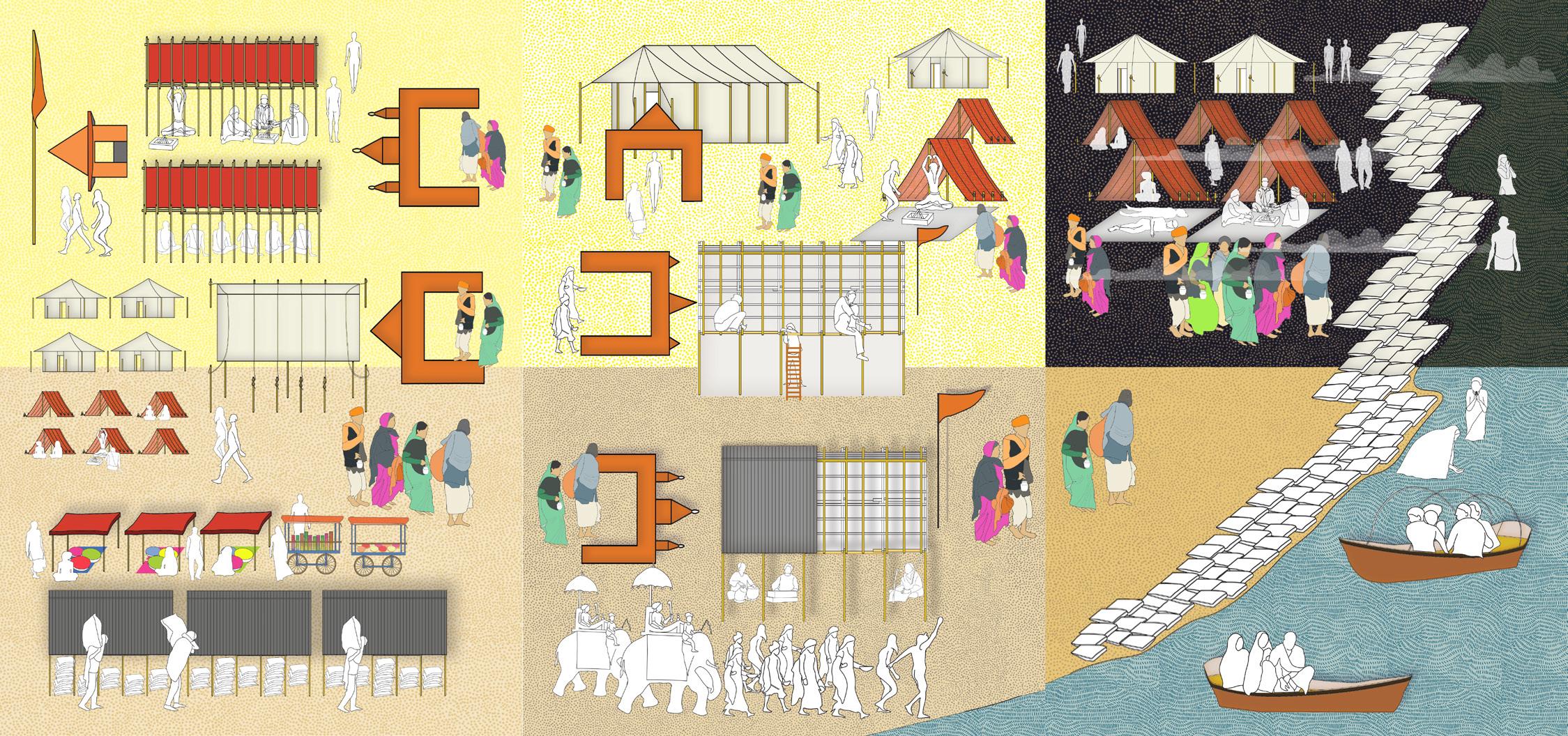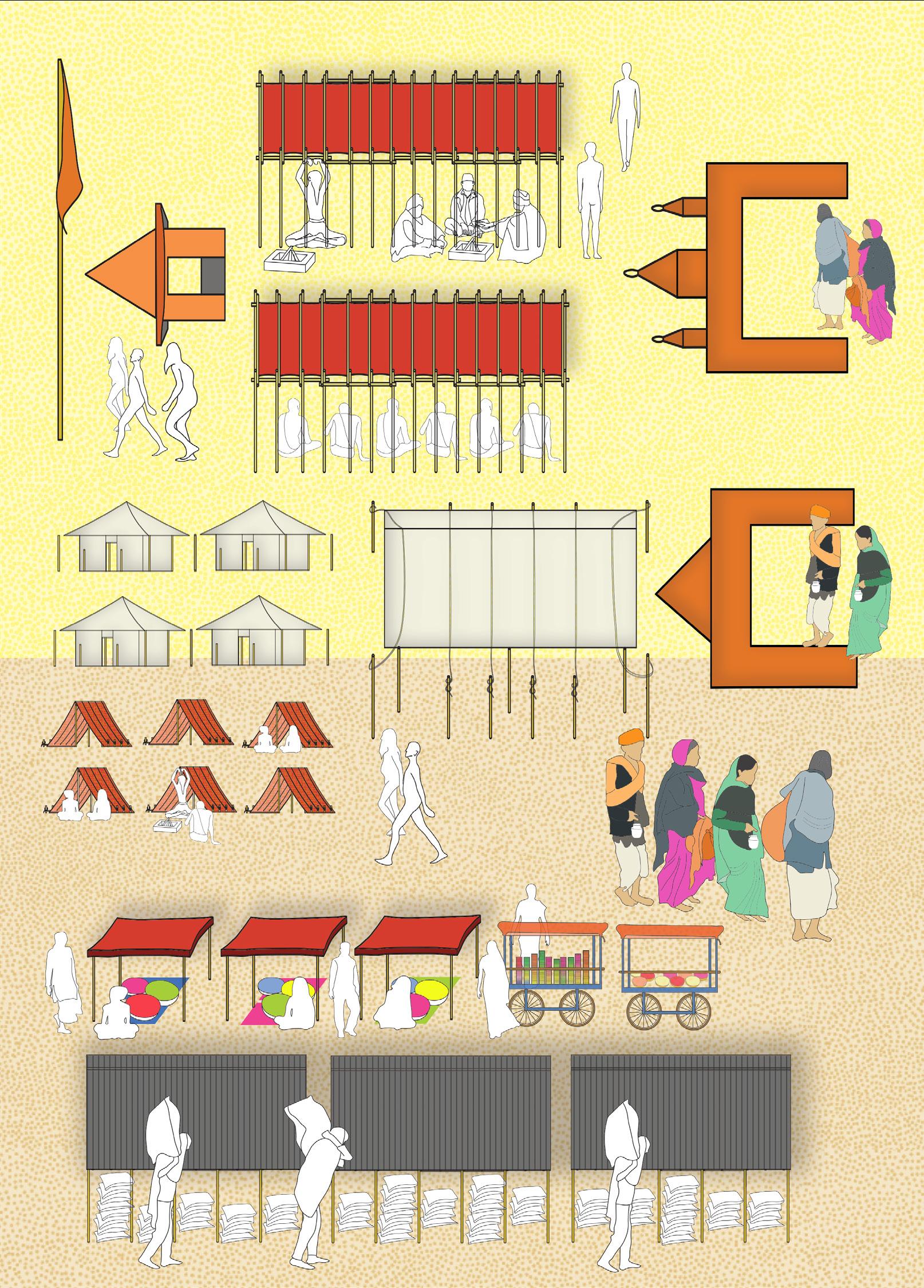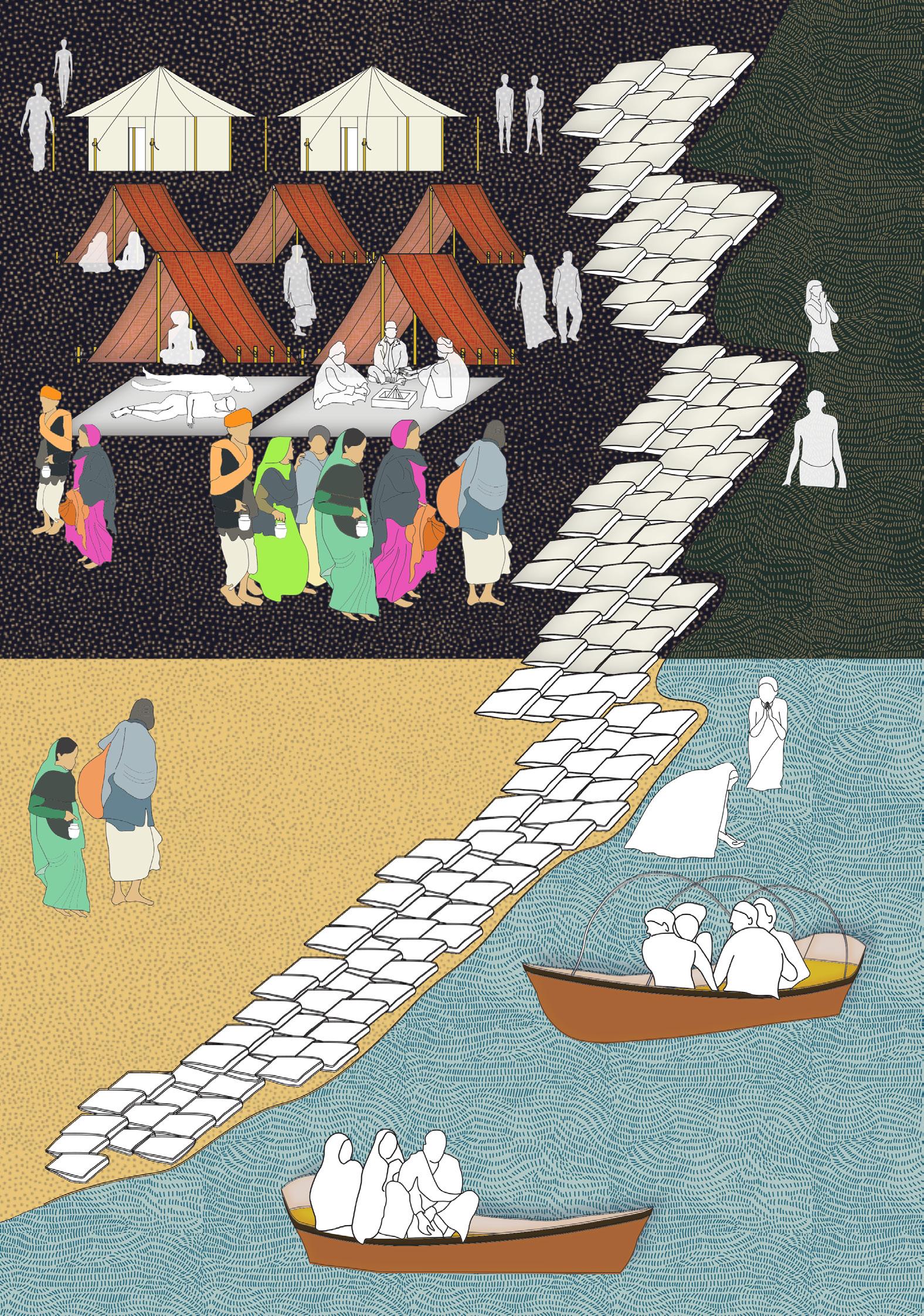 The dissertation is a series of short chapters focused on the spatial representation of the Kumbh Mela at Prayagraj. It aims to challenge the prevailing imagery of the festival by substantiating it with suitable arguments. The first part of the thesis lays the foundation for the project and introduces the principal themes of the study. The second part will introduce the site with its brief history, and its popular discourse. The third part focuses on the methodology used to corroborate the arguments and the final part will conclude with the construction of a tent as a prototype and production of images, thereby addressing the socio-spatial relationships and urban practices embedded in the festival.