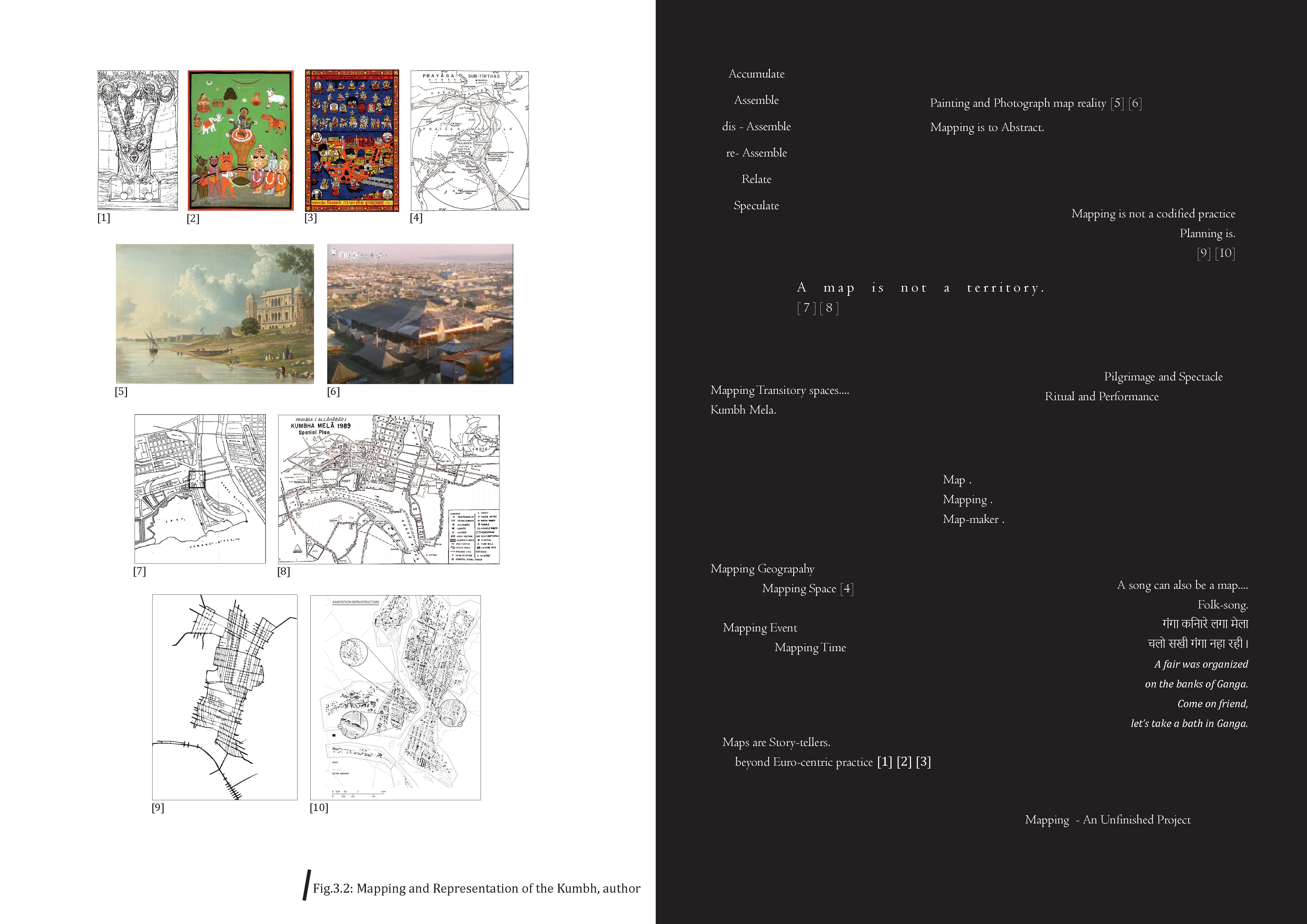 The Kumbh Mela is a temporal event that acts as an urban theatre in a liminal space (See, Fig.3.3). Time and socio-spatial relations are central themes of this event. Tents act as third spaces where new relations and active interactions take place. “A different approach to mapping that does not rely on standard cartographic conventions will also imply a different understanding of space and time” (Awan, 2017, p.35). According to mapping theorist James Corner mapping involves an act of ‘accumulation, disassembly and re-assembly’ (Corner, 1999, p.95). It is a process of extracting ‘new latent relationships.’ (Corner, 1999, p.95). Similarly, Nishat Awan, a South-Asian scholar of countermapping also states, “A key feature of all maps is their ability to visually depict different realities by distilling and privileging some information over others” (Awan, 2017, p.33). The power of mapping to produce multiple narratives will increase its accessibility (Corner, 1999; Kitchin and Dodge, 2007; Awan, 2017). The following research deviates from the rigidity of the current cartographic practises to establish new modes of understanding spaces.