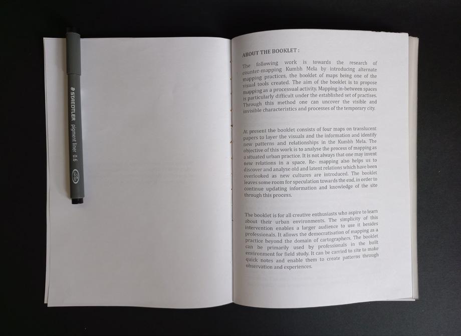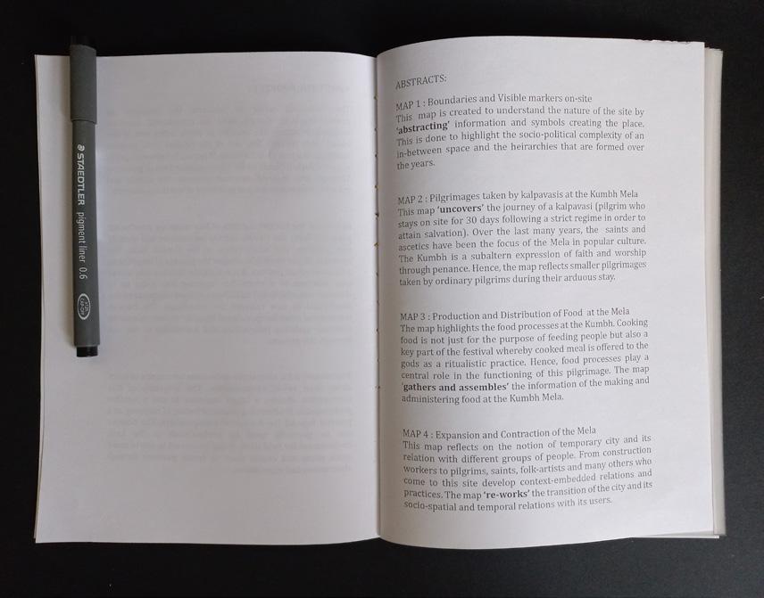 The dissertation uses counter-mapping methods to reposition the festival beyond its portrayal of a ‘temporal city’ to a potential ‘third space’ within the urban realm. The spatial typologies of the festival are rooted in geographical and context-based practices. Recognising the complexity and diversity of the temporal city through mapping, the research develops a methodological approach towards mapping as a situated practice. The workshop conducted for this research resulted in creating ‘visual think-pieces’ to reflect on the multi-layered nature of the festival and decode issues around the agency to represent local spaces. The research produces ‘sensescapes not landscapes’ to map the experience of the Kumbh Mela. It compiles the material and affective qualities of the festival and creates alternate knowledge systems to uncover future possibilities for the site. The research will assist in rethinking the process of mapping across various visual media and will build on the existing position of mapping as a continuous process and an open-ended project.