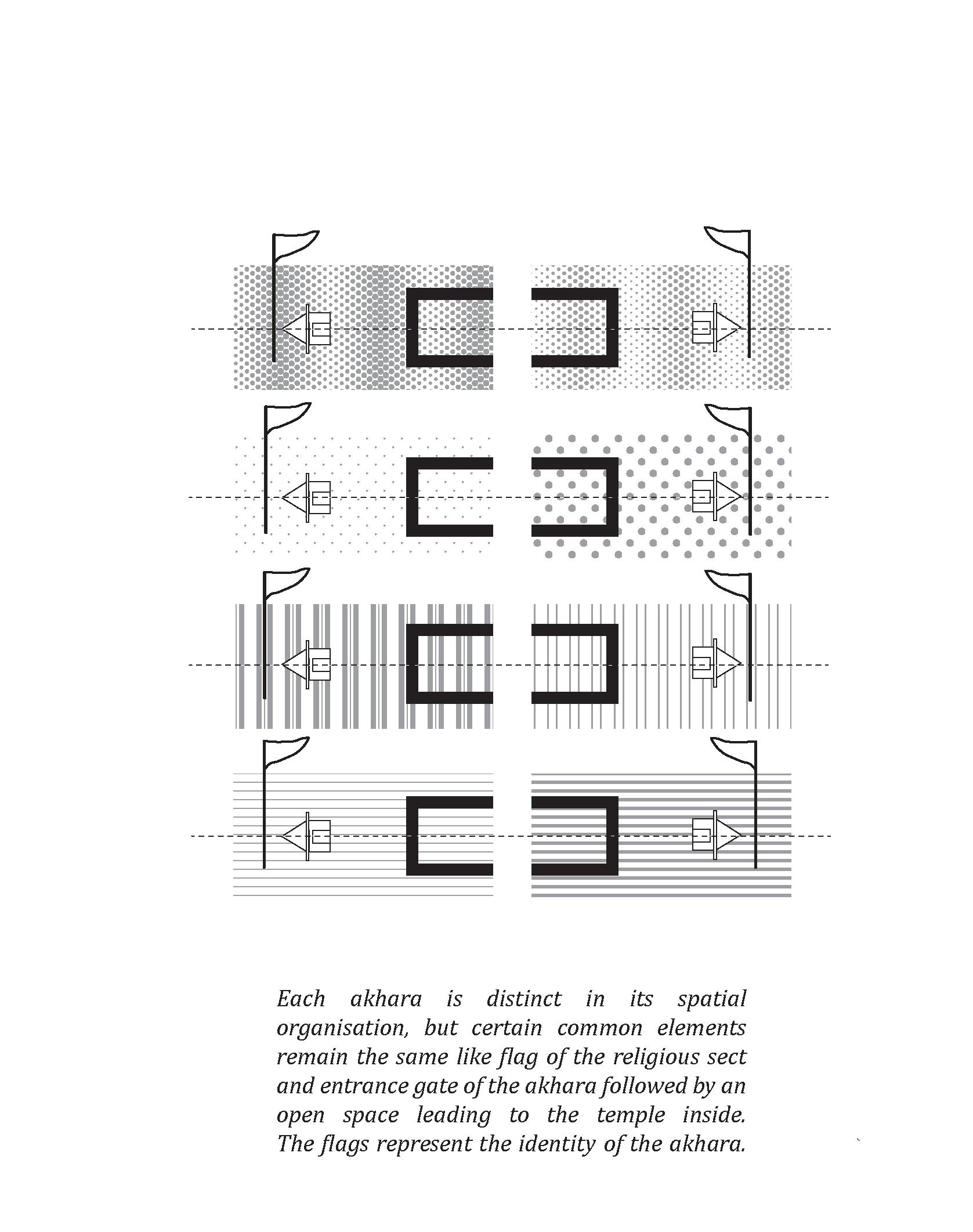 people, water and power supply and shops with essential commodities and religious paraphernalia for the pilgrims. For this purpose, an urban grid is laid on the site of the Kumbh that is divided into sectors, each configured differently into having its own camp. The grid layout is a colonial construct (Mehrotra et al., 2015, p.71). The grid structure is decided based on the morphology of the site. Post-monsoon as the river recedes, the layout of the Kumbh is decided based on the final shape of the landform. Hence the spatial plan of the site is different for every Kumbh. Research conducted by Harvard (Mehrotra et al., 2015, p.73) highlights the uniqueness of this grid compared to other temporary settlements as not being ‘repetitious in a way that erases originality and identity’. The akharas are given the liberty to decide the internal structure thereby giving them the agency to self-expression. As a result, the internal organisation of camps in each sector is different. This form of hybrid urbanism leads to adaptability and local empowerment thereby allowing each group to devise their own spaces.